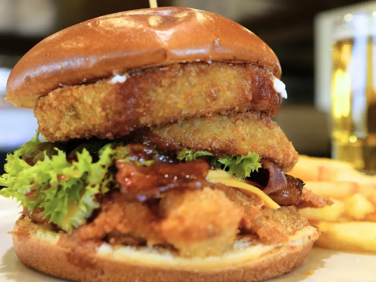 Dos jugosas carnes de vacuno (180g U), doble queso cheddar derretido, doble tocino crujiente, aros de Milan, pepinillos, lechuga crujiente y nuestra exclusiva salsa Piccola (una creacion especial de la casa). Complementada con salsas tradicionales (Ketchup, Mayo y BBQ). Acompañada de crujientes papas fritas (150g).