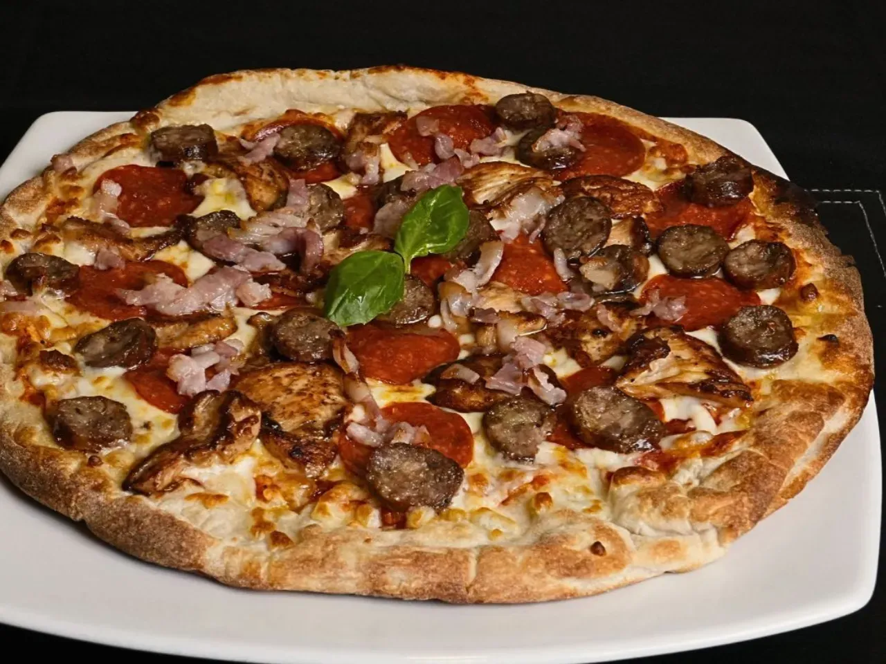 Nuestra base de masa artesanal viene cubierta con salsa pomodoro y queso mozzarella. A esta se suman ingredientes selectos: chorizo de la casa, tocino crujiente, pollo tierno y pepperoni de primera calidad