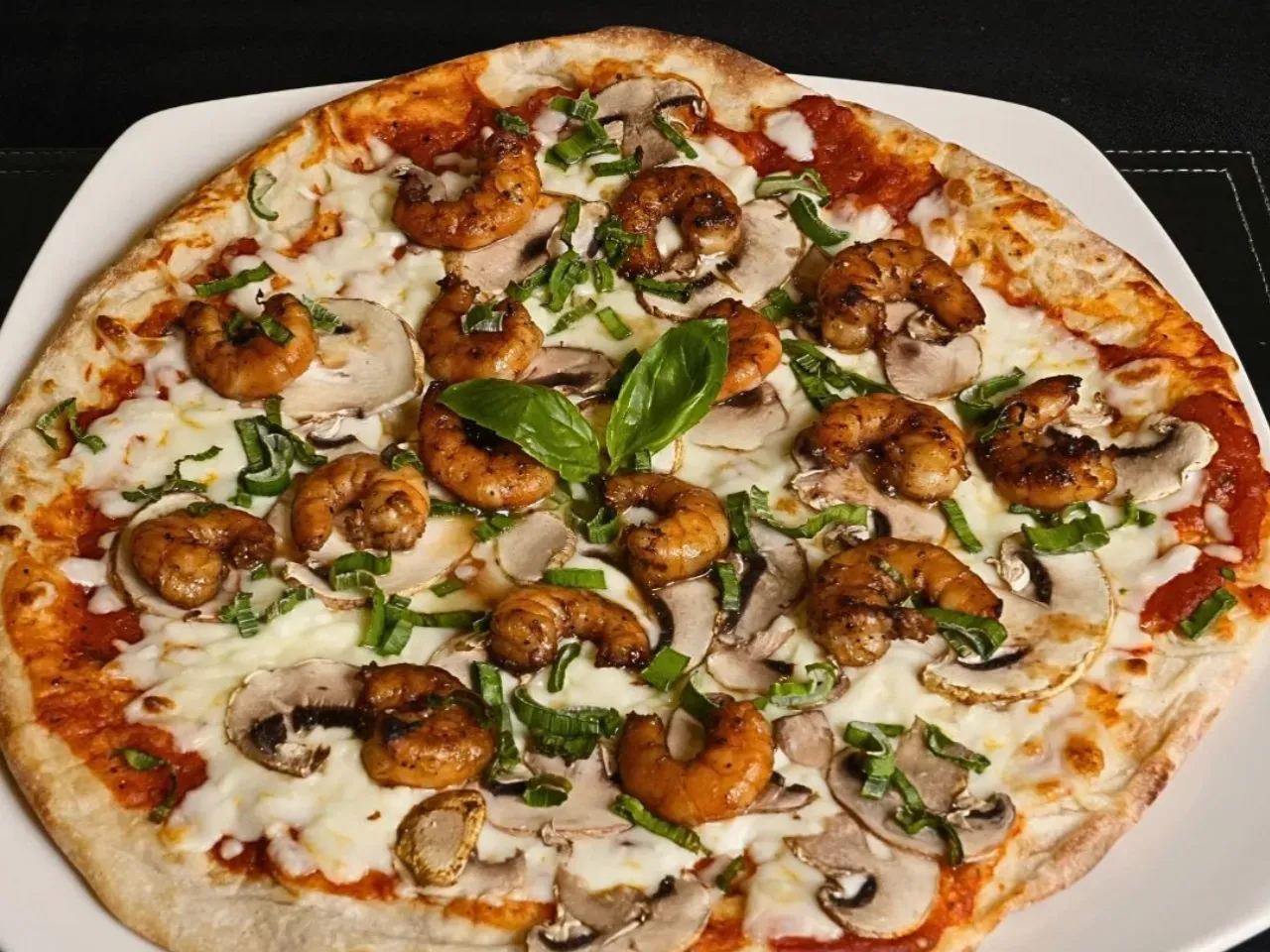 Sobre la tradicional base de masa artesanal, salsa pomodoro y queso mozzarella, añadimos camarones ecuatorianos, champiñones frescos y cebollin tierno. Esta combinacion marina y terrestre ofrece una experiencia gastronomica equilibrada y rica en sabor.