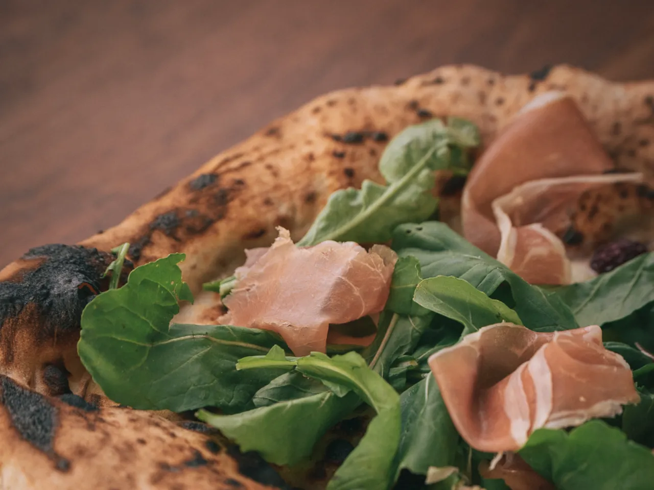 Pizza con base de Fondue de queso parmesano Grana Padano (Italia), Mozzarella Fior di Latte (Italia), Berries de la estación, Rúcula Fresca, Prosciutto di Parma (Jamon curado importado de Italia), Nueces y un toque de Miel de Palma
