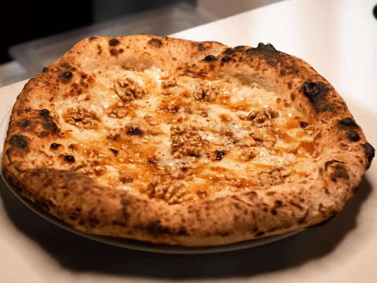 Base de fondu de queso parmesano Grana Padano D.O.P (Italia), doble queso de Cabra, nueces mariposa y toques de miel de palma. Pizza de moda en los Alpes franceses 2025.