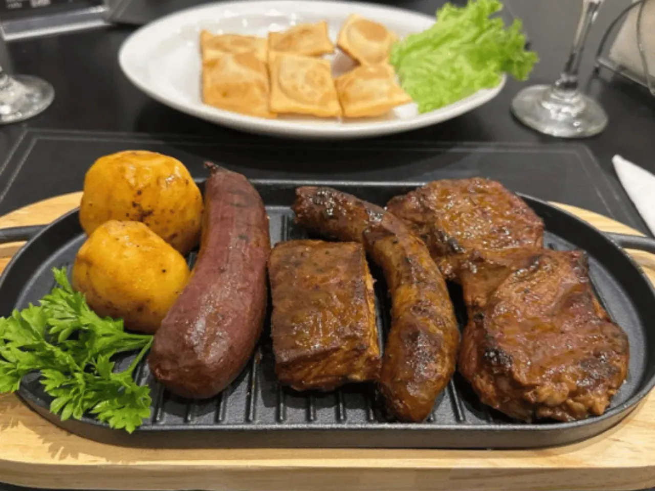 Exquisita Parrillada Individual contiene 200grs de Lomo Liso, 125grs de nuestro delicioso Chorizo de la casa, 1 Prieta, 1 Costillita y papas cocinas.
