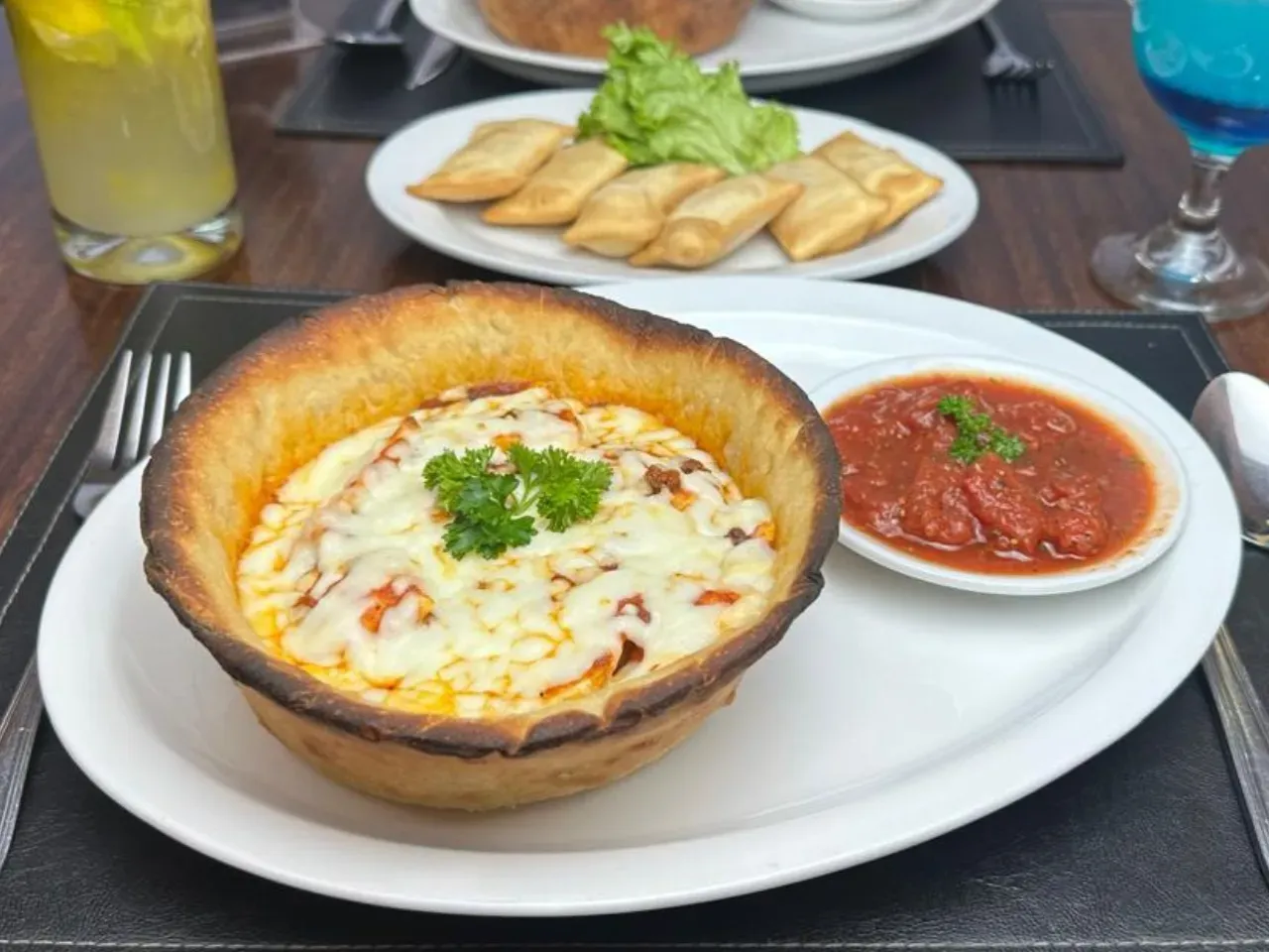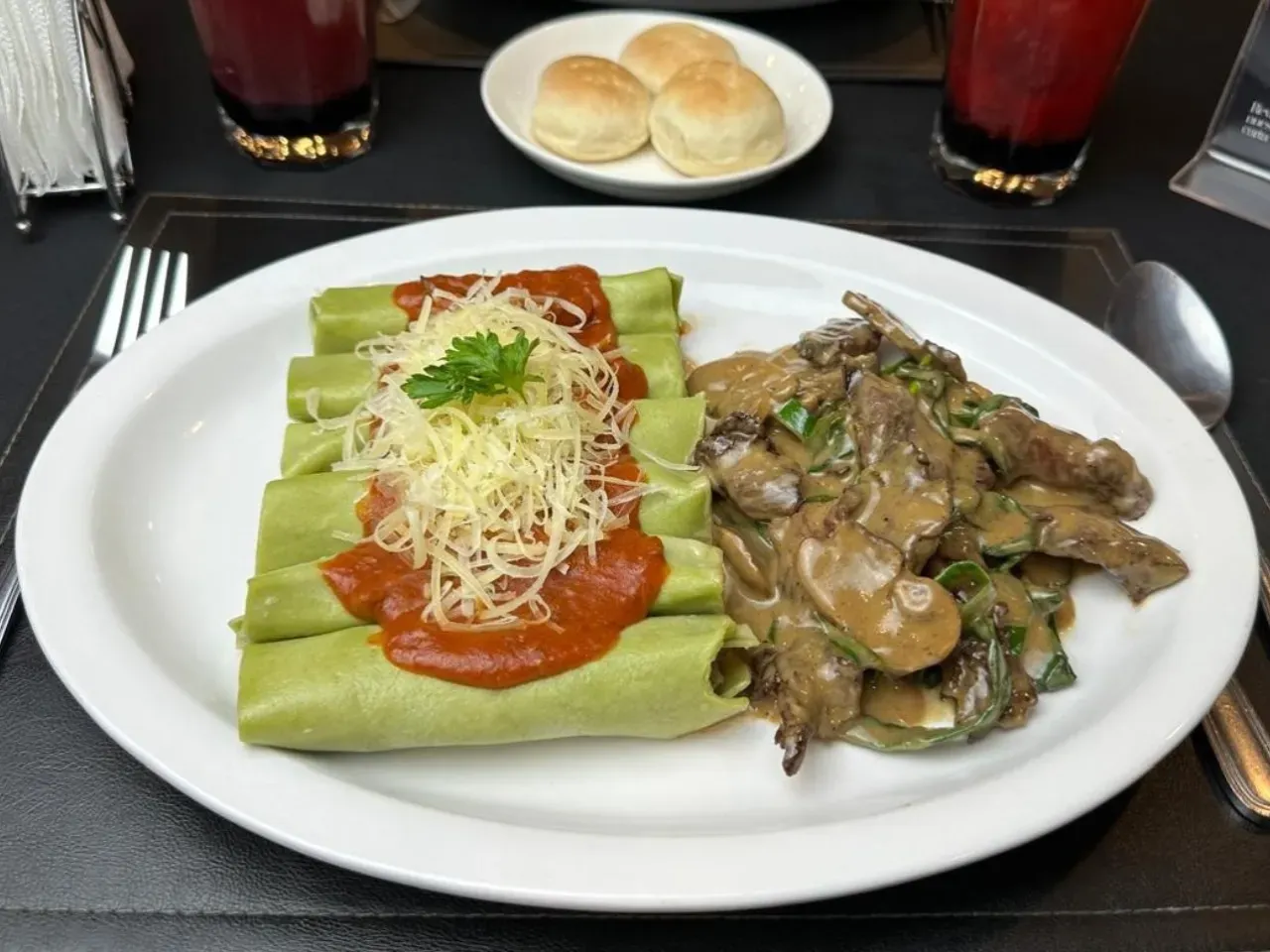Exquisitos Canellone hechos a mano, bañados en nuestra deliciosa salsa bolognesa, acompañados de una Carne Piamontesa.