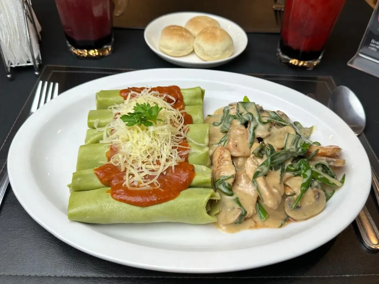 Exquisitos Canellone hechos a mano, bañados en nuestra deliciosa salsa bolognesa, acompañados de un Pollo Piamontesa.