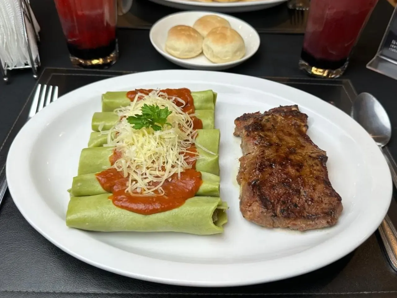 Exquisitos Canellone hechos a mano, bañados en nuestra deliciosa salsa bolognesa, acompañados de un lomo grillado de 300g, jugoso y lleno de sabor.