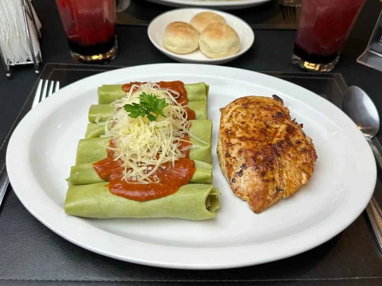 Exquisitos Canellone hechos a mano, bañados en nuestra deliciosa salsa bolognesa, acompañados de un exquisito Pollo a la Parrilla.