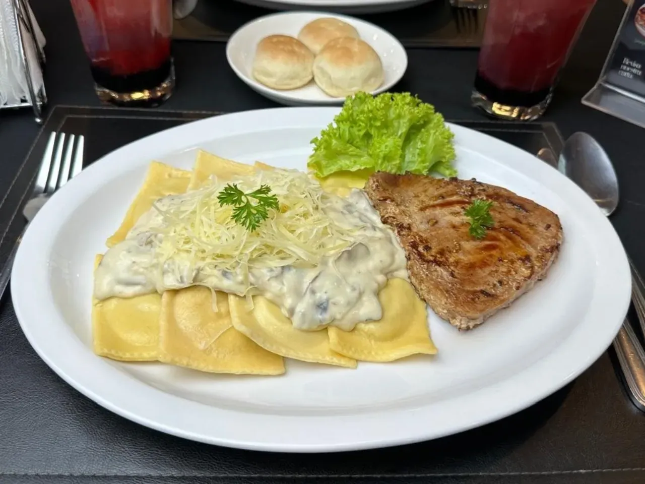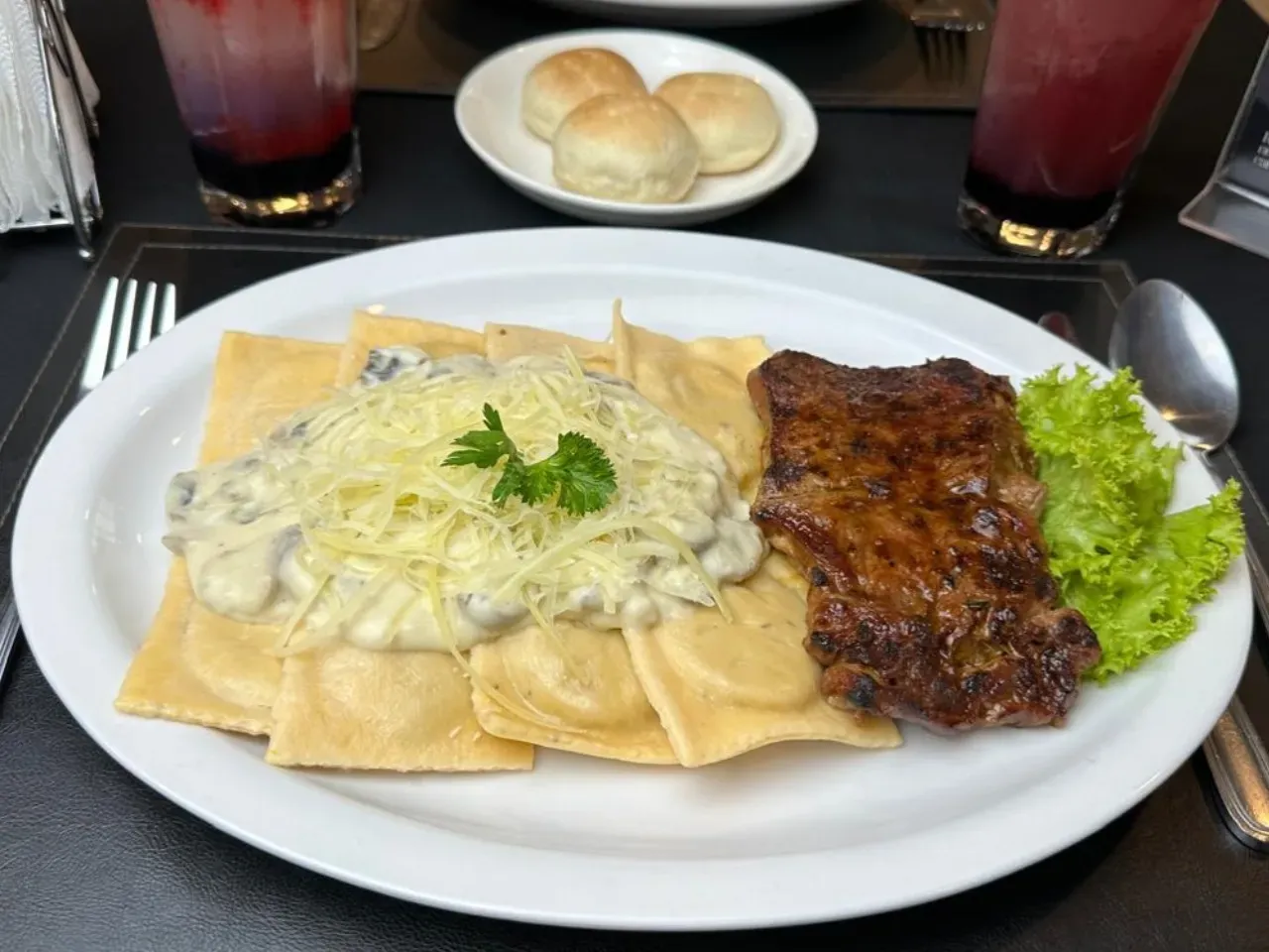Exquisitos Ravioles hechos a mano, bañados en nuestra deliciosa salsa de champiñones, acompañados de un lomo grillado de 200g, jugoso y lleno de sabor.