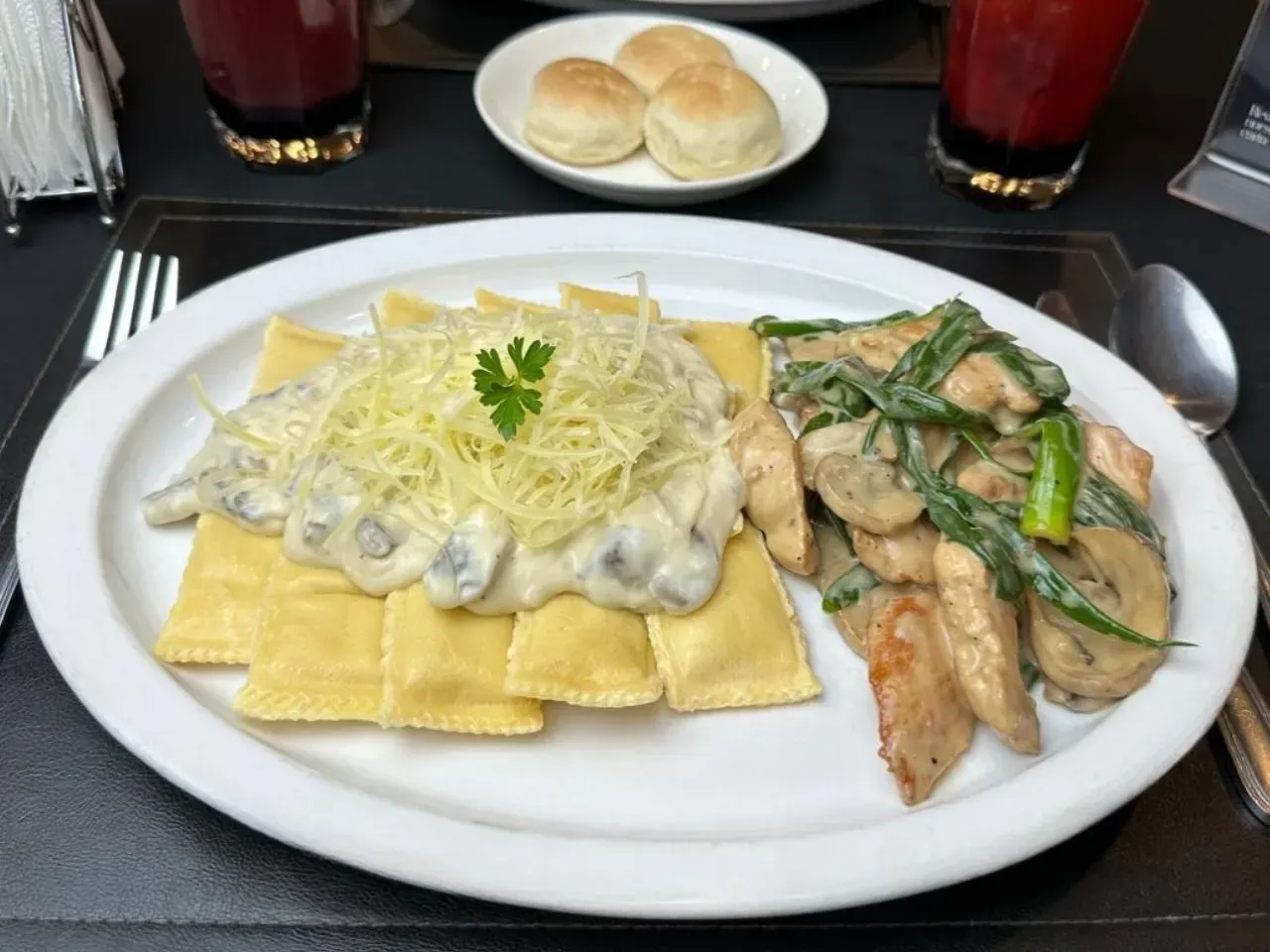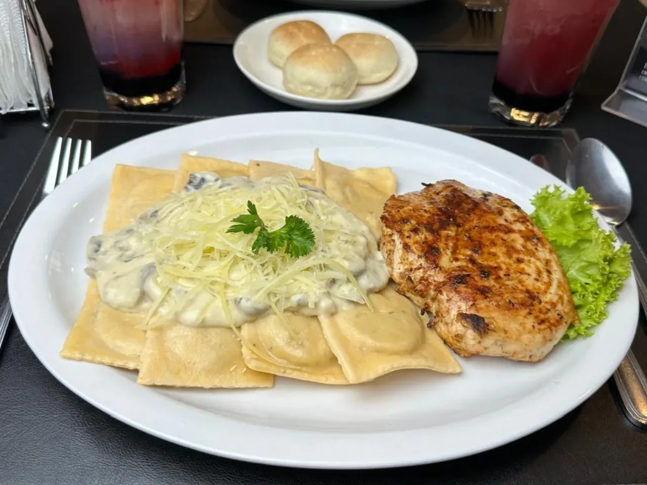 Exquisitos Ravioles hechos a mano, bañados en nuestra deliciosa salsa de champiñones, acompañados de un exquisito Pollo a la Parrilla.