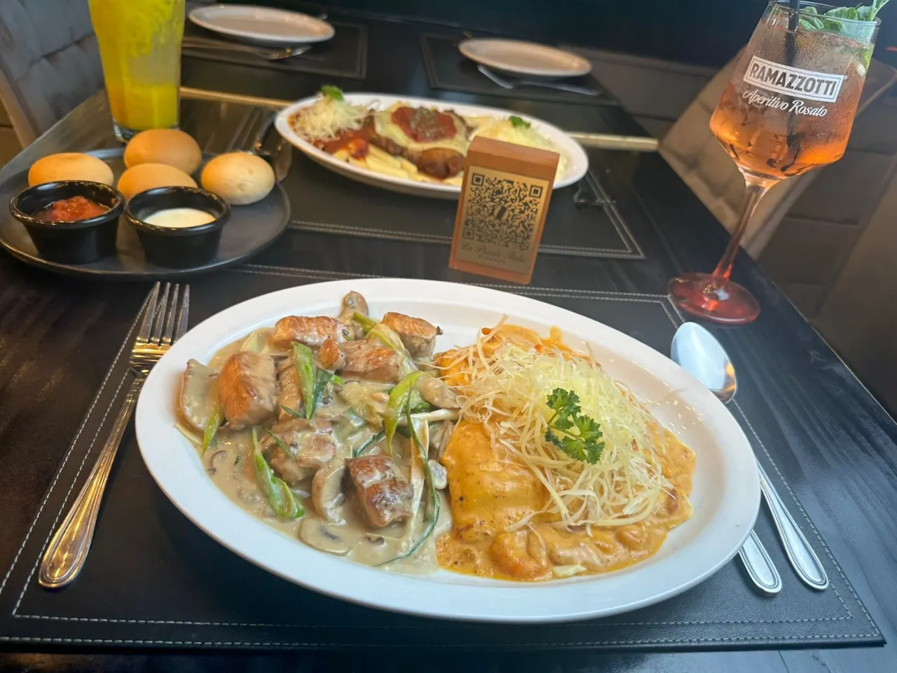 Exquisitos Ravioles hechos a mano, bañados en nuestra deliciosa salsa de champiñones, acompañados de una exquisita Carne Piamontesa