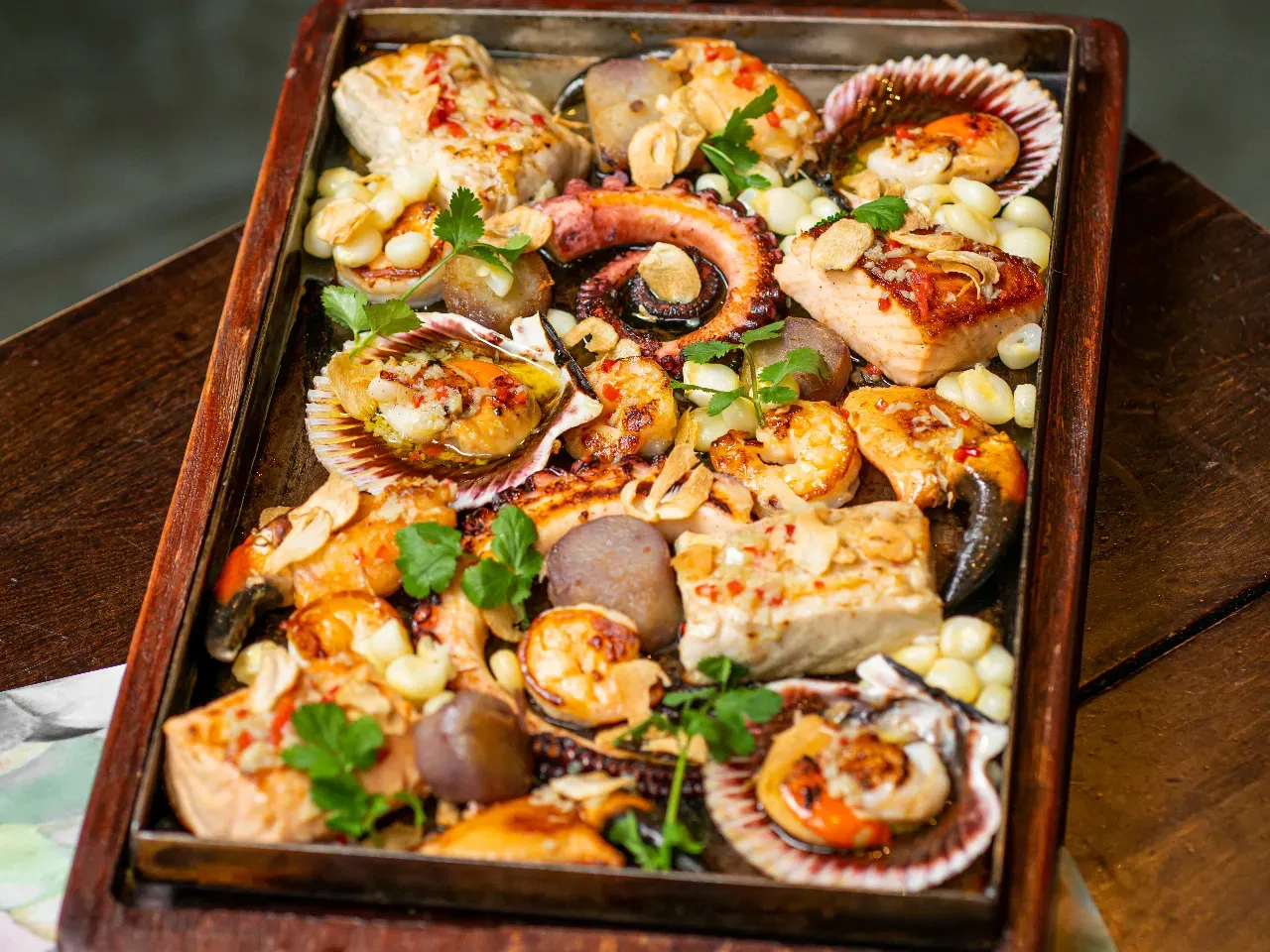 Pesca del día, camarones, ostiones, pulpo, pinzas de jaiba y lo mejor del mar en mantequilla de ajo y rocoto.