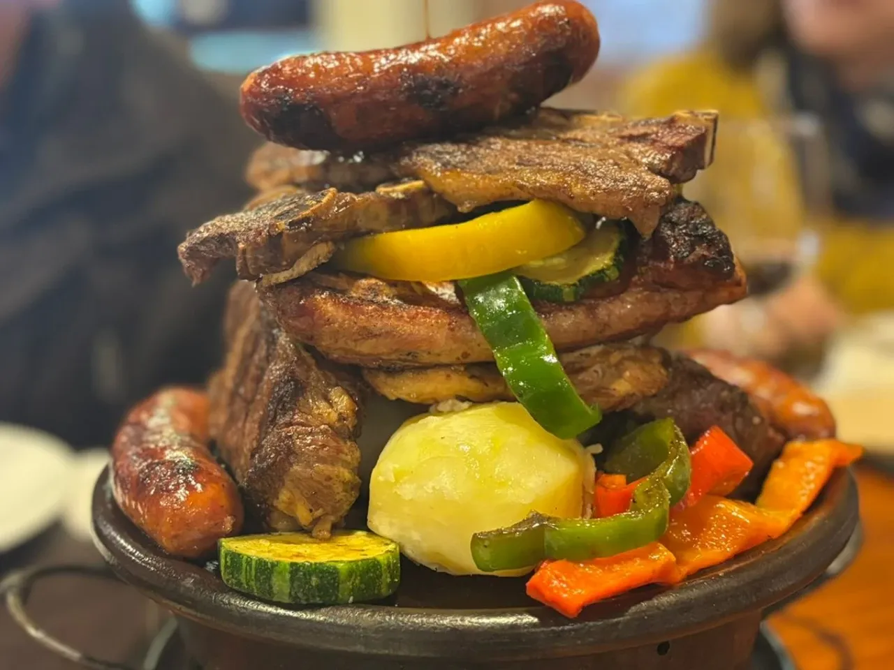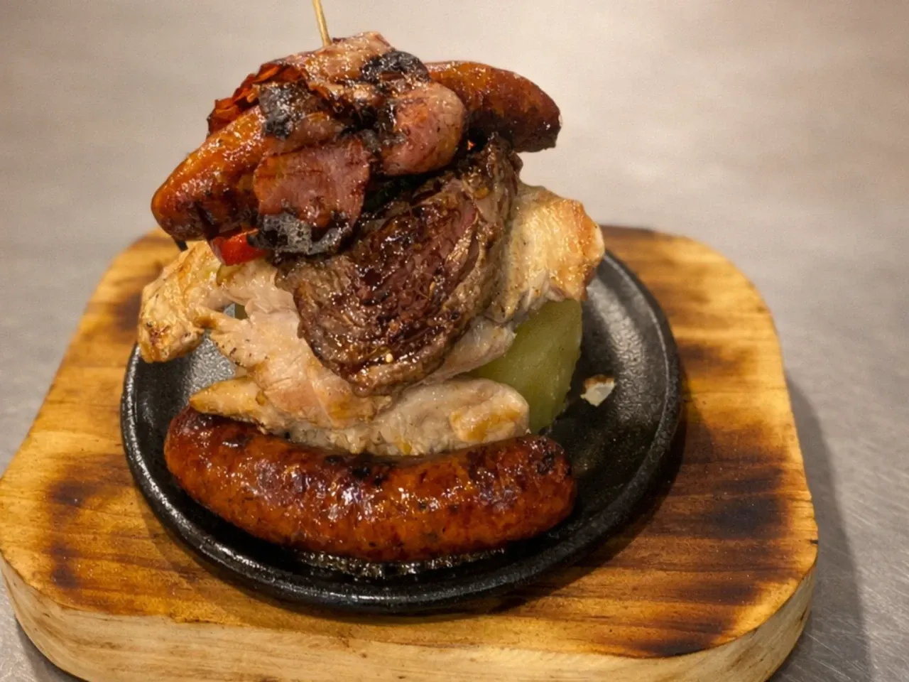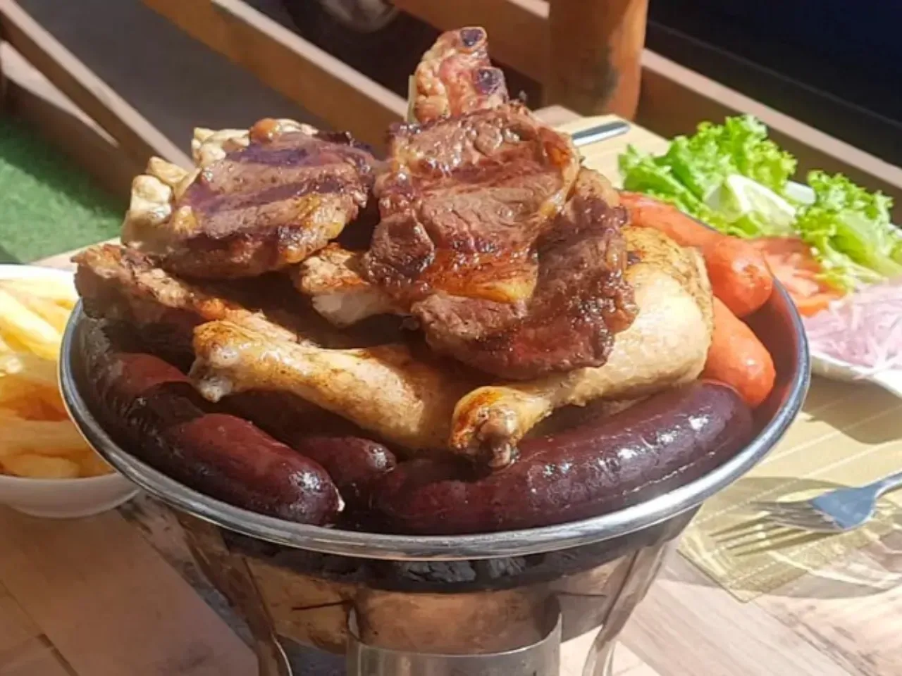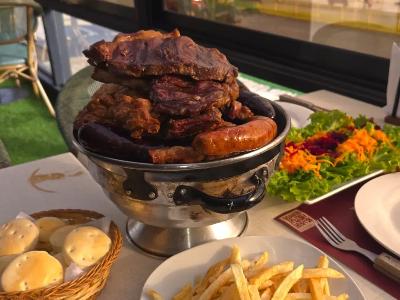Un festín de la casa: asado de tira, lomo liso, pechuga de pollo, chorizo parrillero y costillar de cerdo, servidos con papas al vapor, verduras asadas y ensalada de la estación. Incluye vino de la casa.