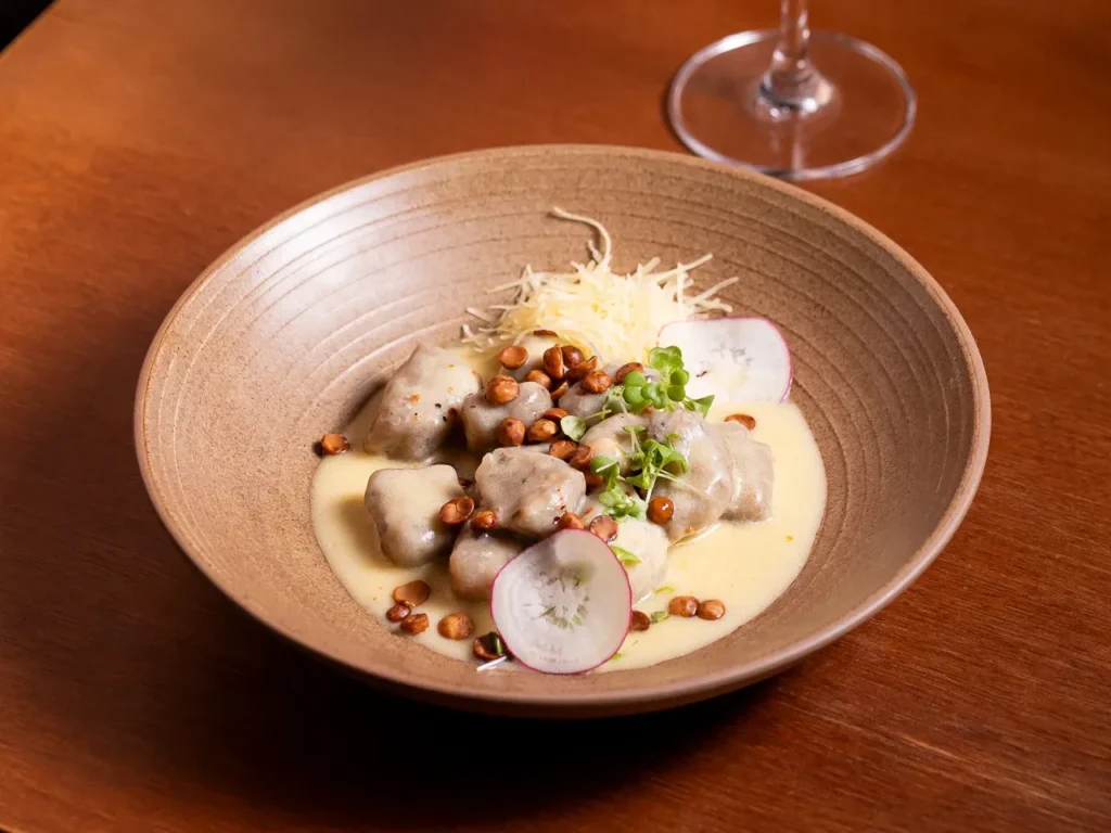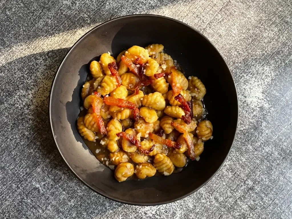 Suaves gnocchi de papa salteados en mantequilla y caldo de vegetales, con panceta de cerdo, pimienta y un toque de queso parmesano, realzados con la intensidad del ajo negro.