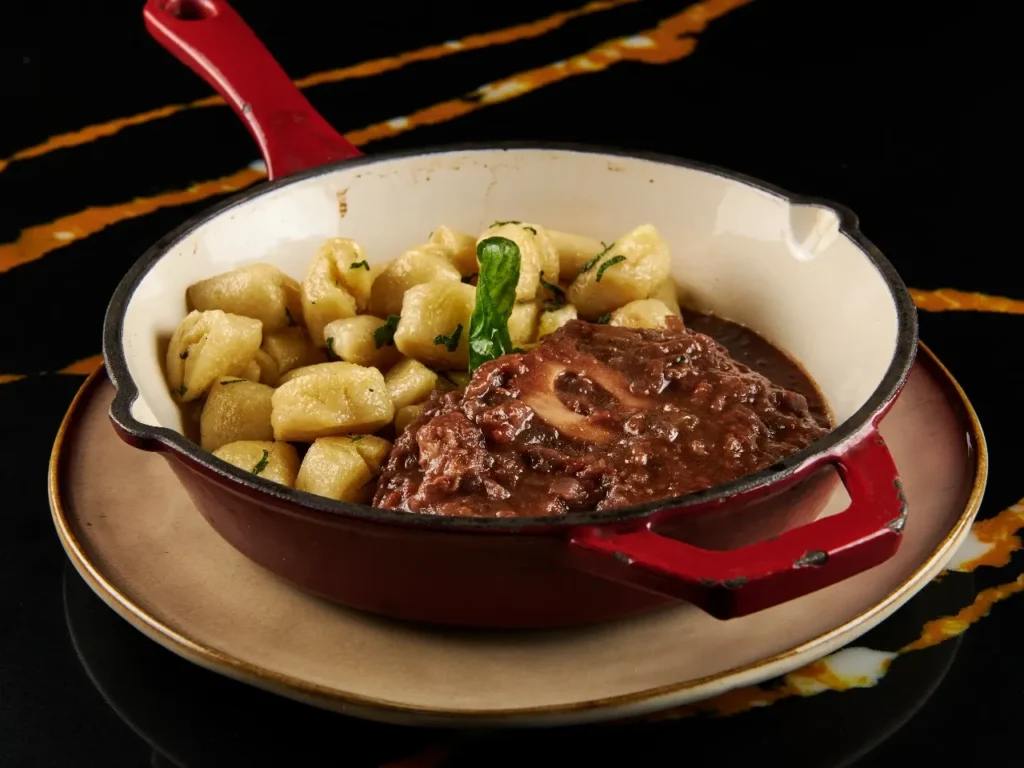 Exquisitos gnocchis de la casa acompañado de una porción de osobuco cocida por 6 horas
