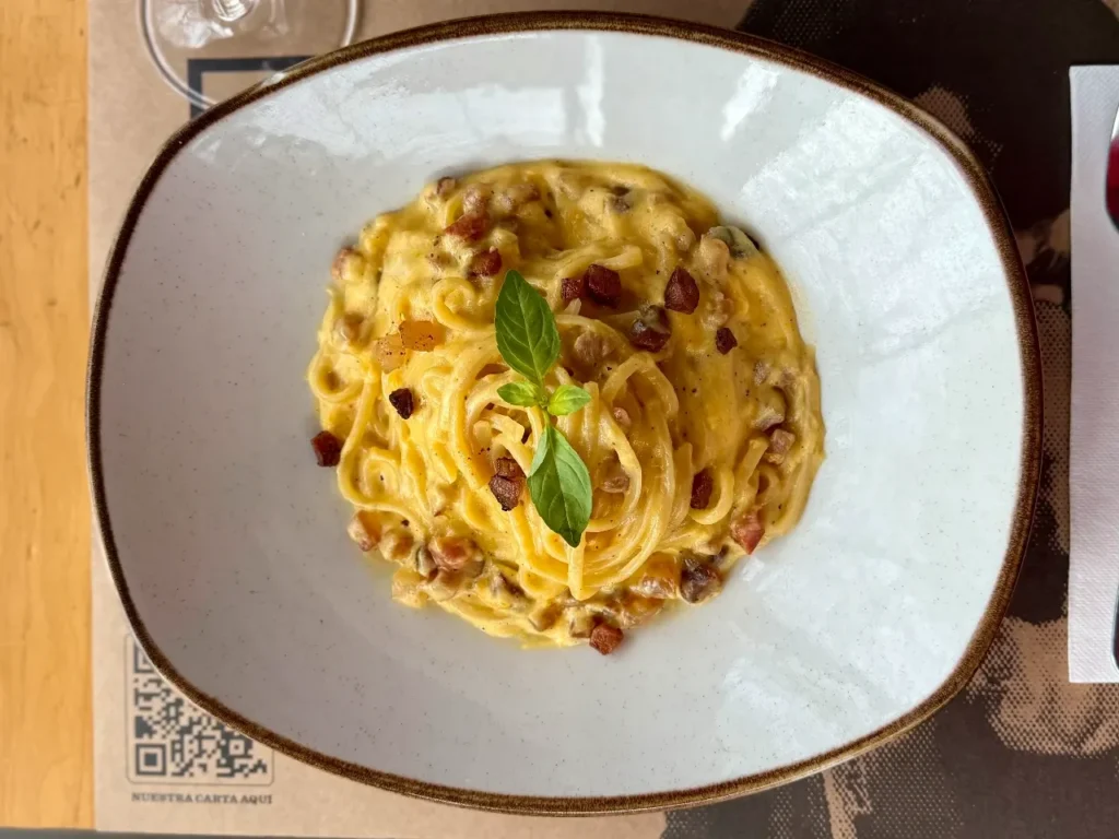 Spaghetti al dente, envueltos en una crema sedosa de yema y pecorino, con crujientes trozos de guanciale que estallan en sabor. Sin crema, sin trucos: solo tradición, intensidad y mucho carácter. Es puro placer romano servido humeante, directo al alma.