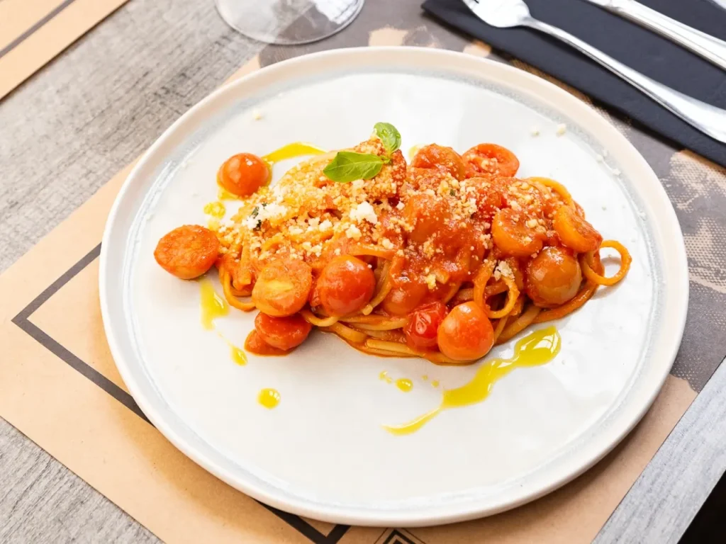 Pasta larga en salsa pomodoro con cebolla, albahaca fresca y tomates cherry, un clásico italiano lleno de frescura y sabor. Cambia tu pasta a Penne Rigate sin nungun valor adicional