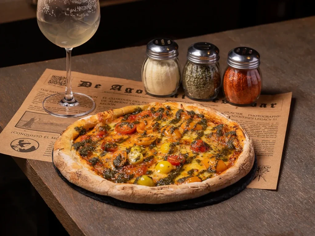 Pizza con masa fermentada 72 horas, salsa pomodoro casera, queso mozzarella fior di latte, tomates cherry asados y pesto de albahaca.