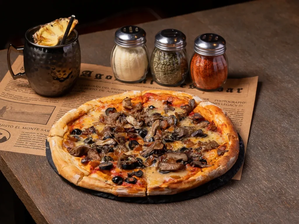 Masa artesanal, setas salteadas (portobello, shitake, champ, parís) cremoso de setas, aceite de trufas, salsa de queso parmesano y queso mozarella.