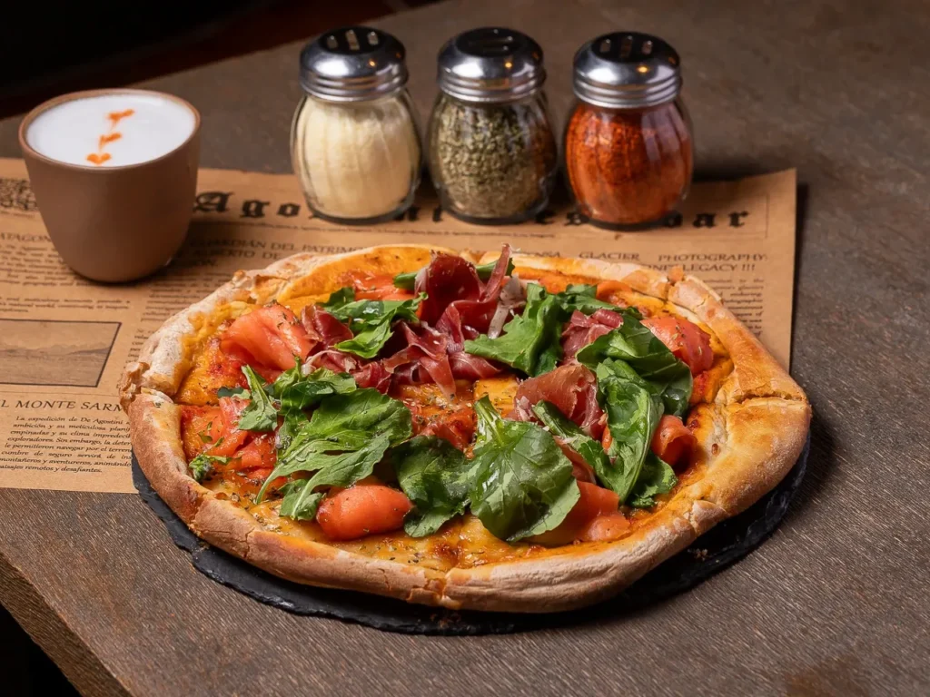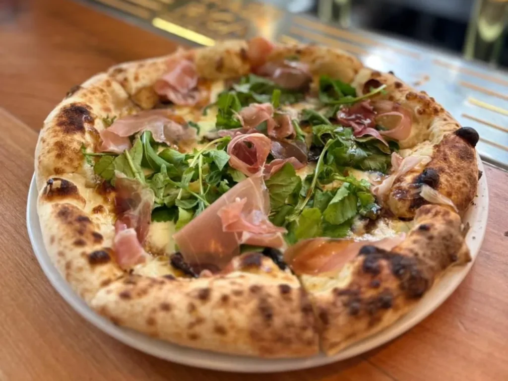 Salsa pomodoro, queso mozzarella fior di latte, hojas de rúcula, prosciutto, queso parmesano y maduración de 24 horas estilo