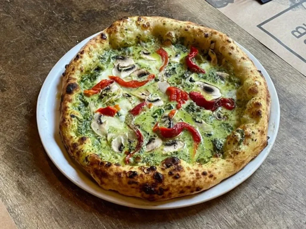 Pizza auténtica napolitana con Ricotta fresca, mozzarella Fior Di Latte, Mortadella de pistacho, albahaca, grana padano rallado y aceite de oliva extra virgen.