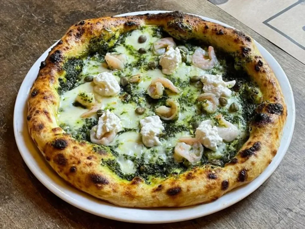 Pizza con salsa Pomodoro natural, queso Mozzarella, camarones, cebolla blanca y perejil.