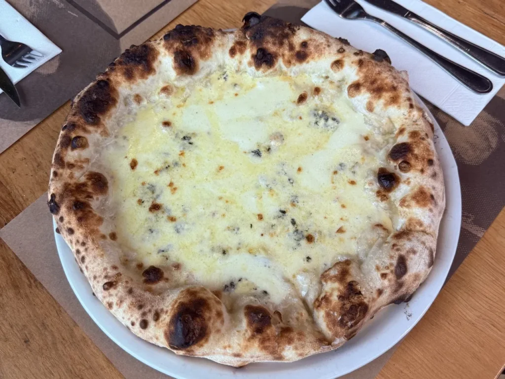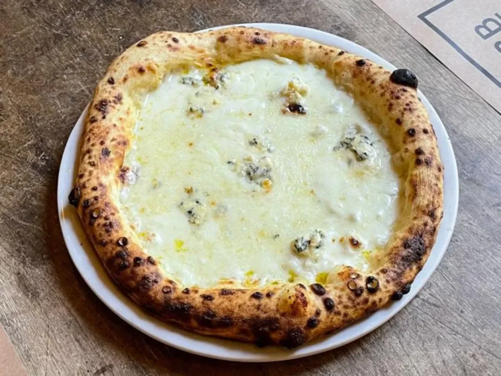 Masa estilo napolitana con base de pomodoro, queso roquefort, queso mantecoso, queso edam y queso parmesano con un toque de aceite de oliva extra virgen.