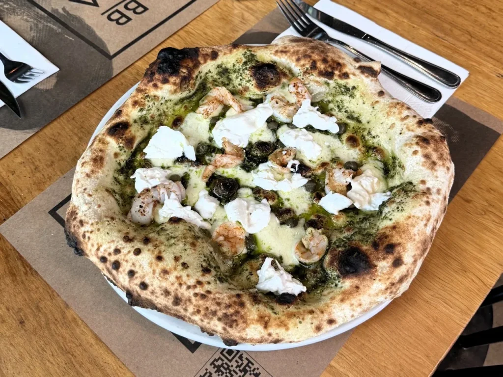 Masa fermentada por 72 hrs, salsa pomodoro, mozzarella fior di late, camarones, palta y rúcula.