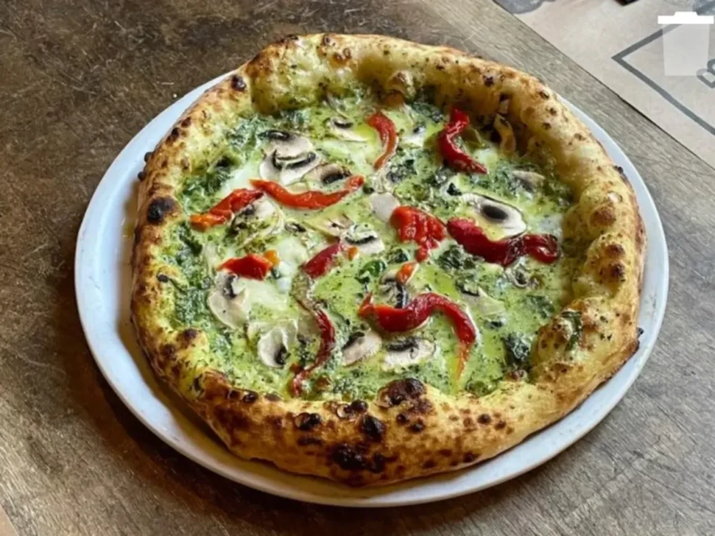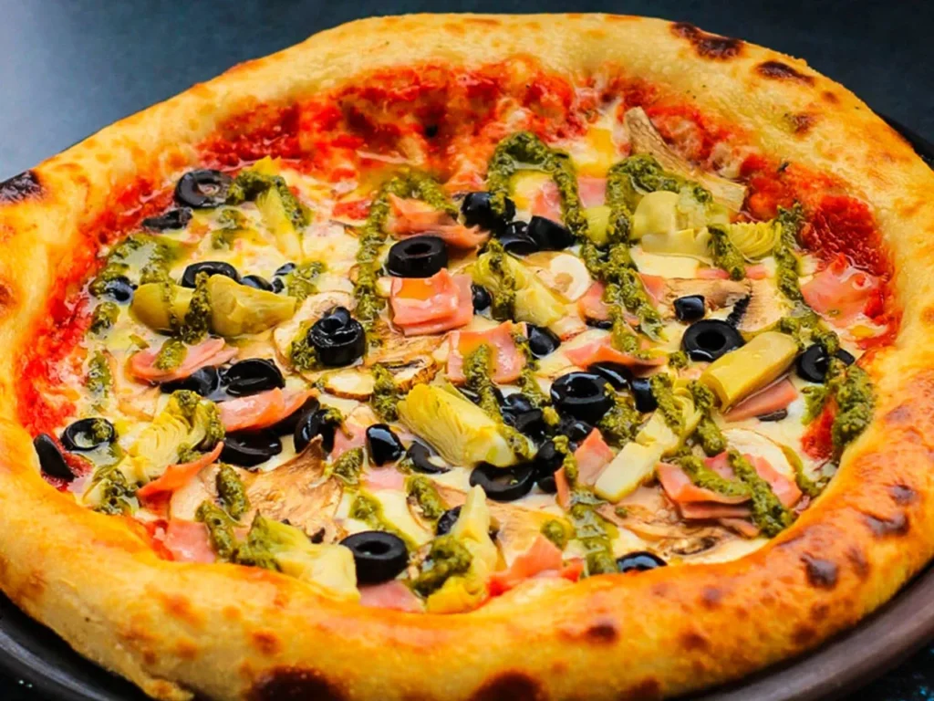 Masa artesanal, jamón, champiñones, aceitunas y alcachofas sobre base de salsa de tomate y mozzarella, coronada con pesto.