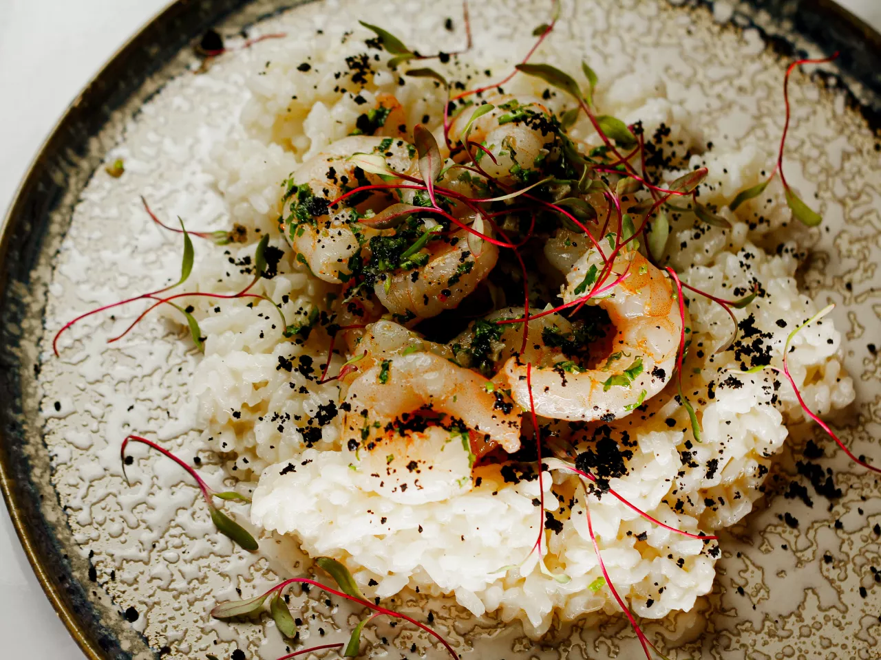 Un risotto que fusiona la tradición italiana con un toque de lujo mediterráneo, utilizando gamba roja y una reducción de Riccadonna asti, para añadir un sabor profundo y festivo.