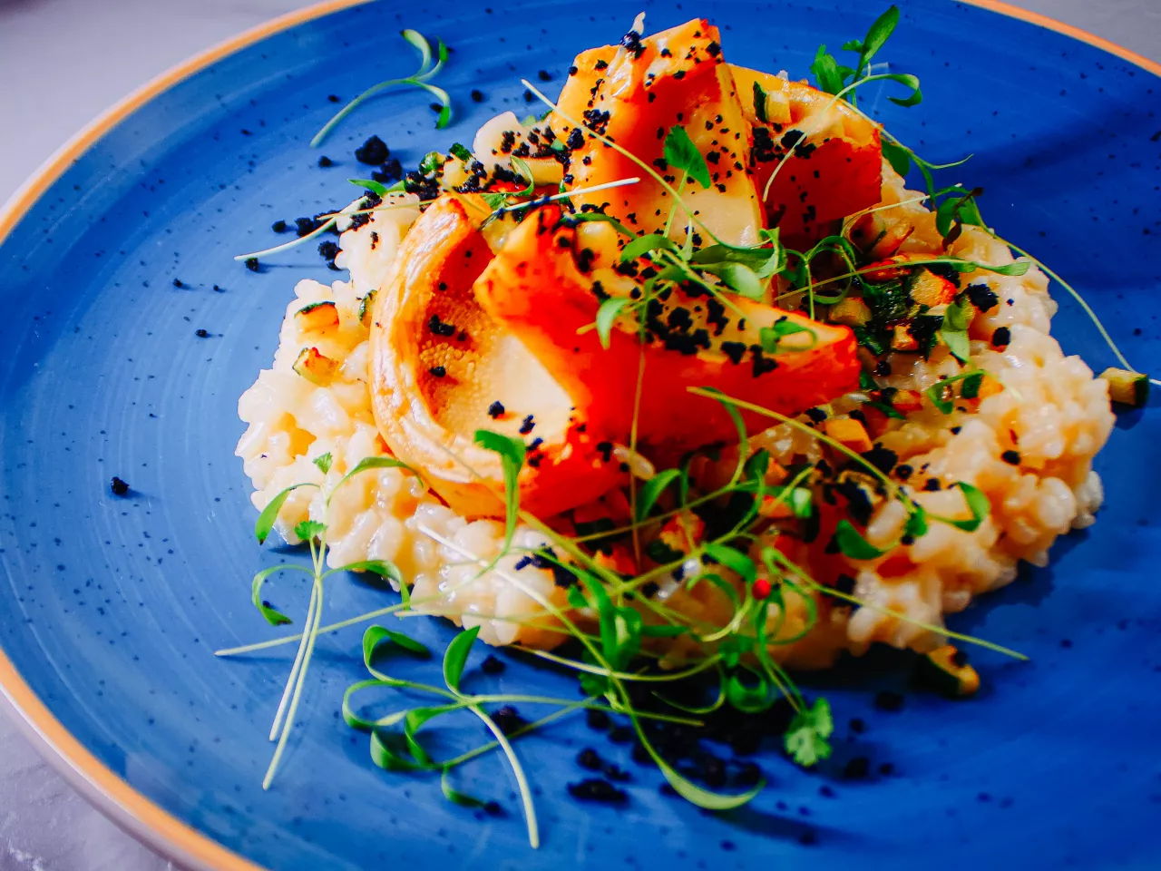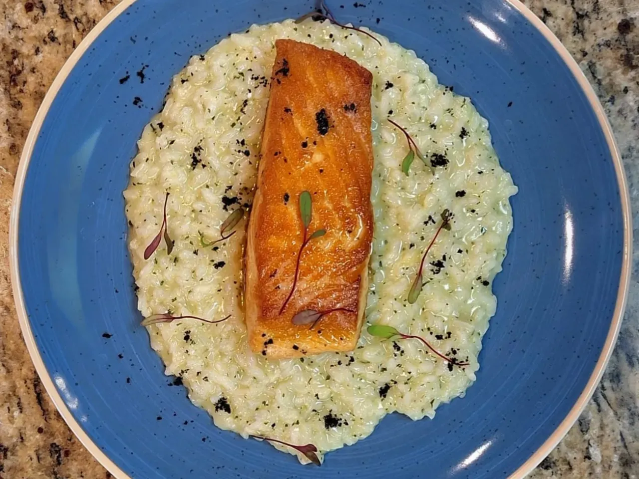 Fresco y jugoso salmón sellado a la plancha y acompañado de un risotto cremoso al estilo tradicional italiano.