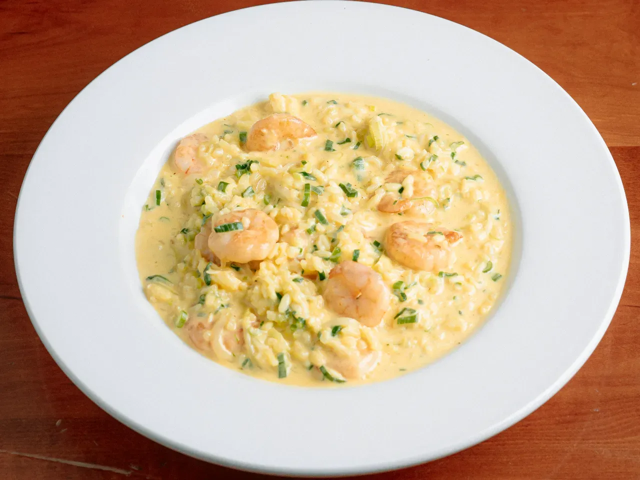 Arroz arborio con base de bisque de camarones, con camarón ecuatoriano.
