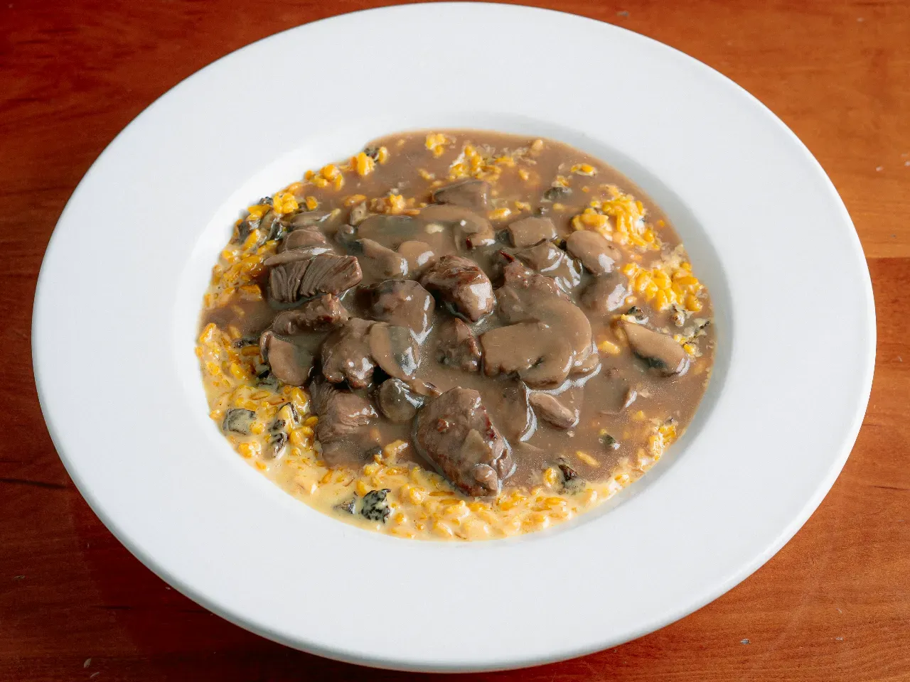 Cremoso risotto preparado al punto, integrado con una suave salsa huancaina, acompañado de jugosos trozos de lomo salteado al wok con cebolla morada y tomate
