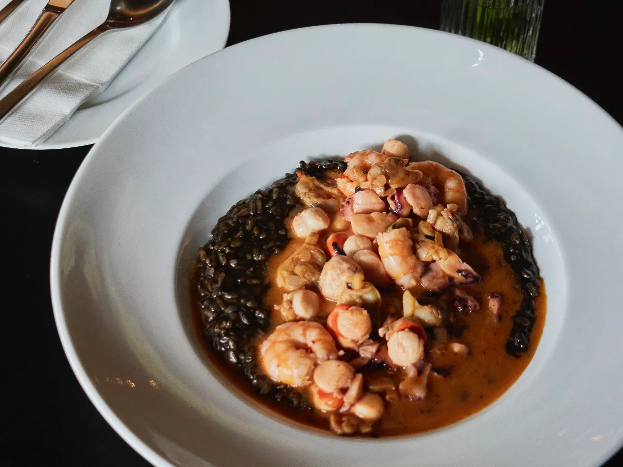 Arroz arborio en base de bisque de mariscos y pescado con locos, camarones, anillos de calamar, ostiones y pulpo.