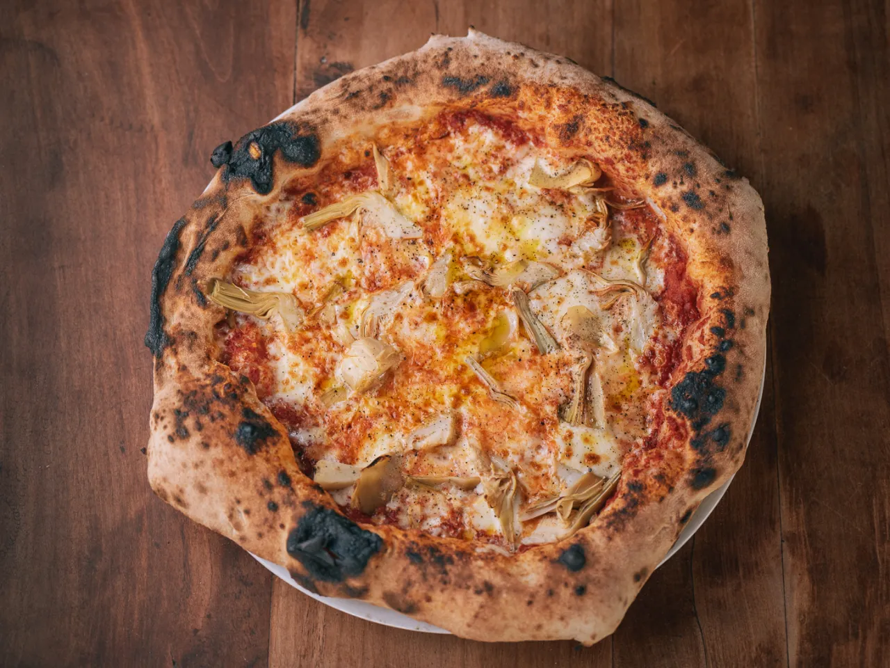 Pomodoro (Italia), mozzarella, queso de Cabra, corazones de Alcachofa, Aceite de Trufa Blanca, Toques de pimienta negra.
