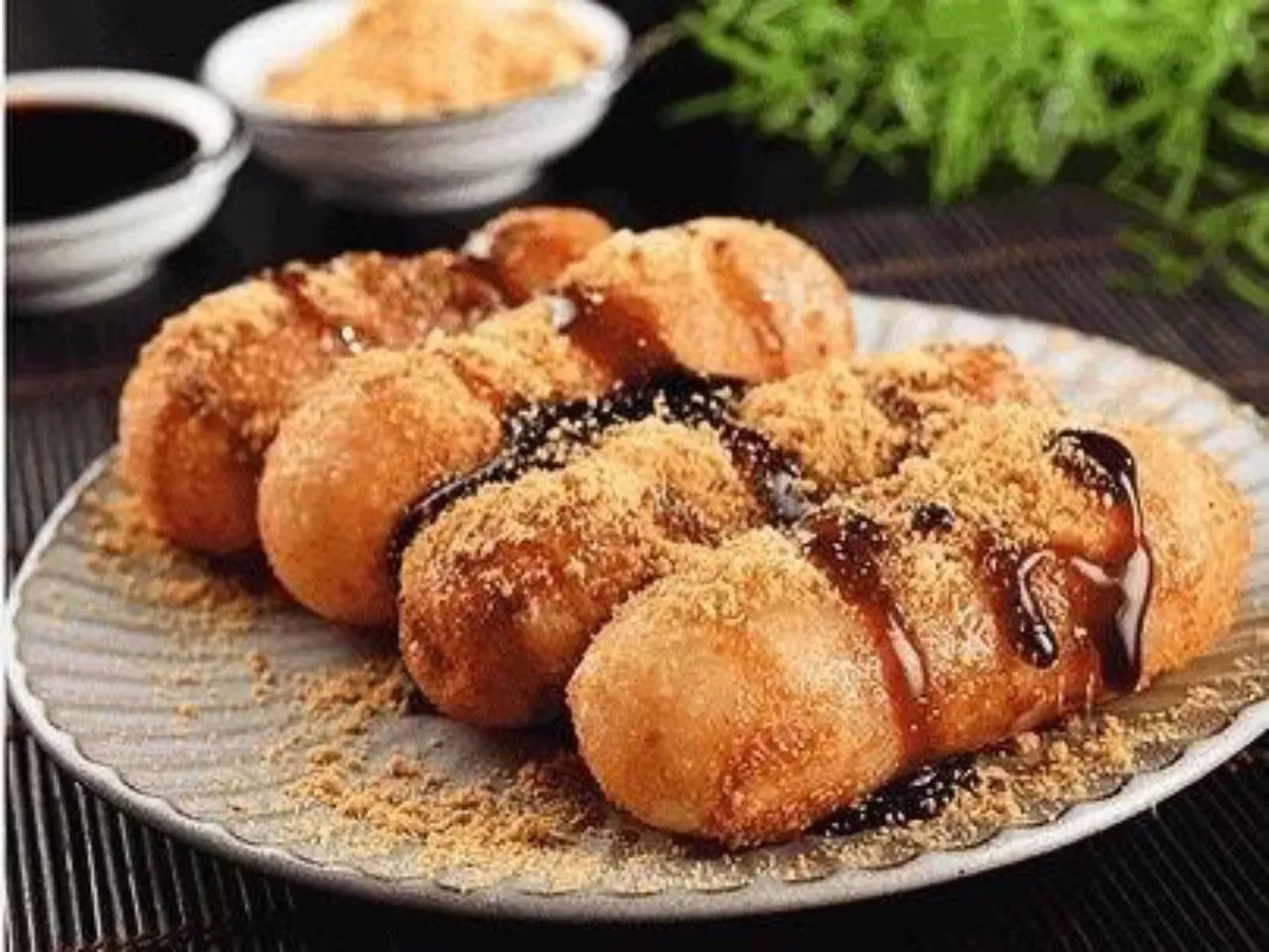 SUAVES Y DELICADAS MASAS DE ARROZ GLUTINANTE FRITAS Y RELLENAS DE CARAMELO ADELGASADO CON UNA TECNICA ASIATICA QUE LE DA UN TOQUE PARTICULARMENTE UNICO.