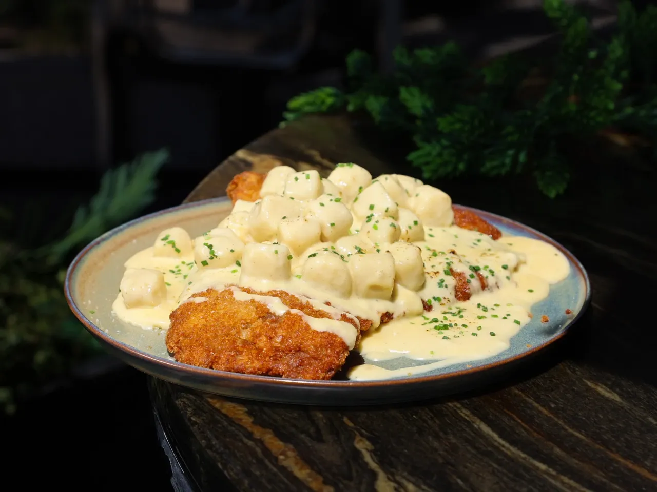 Milanesa dorada y crujiente, coronada con suaves gnocchis bañados en una cremosa salsa bechamel y queso gratinado al momento. Finalizada con un toque de albahaca fresca que perfuma cada bocado.