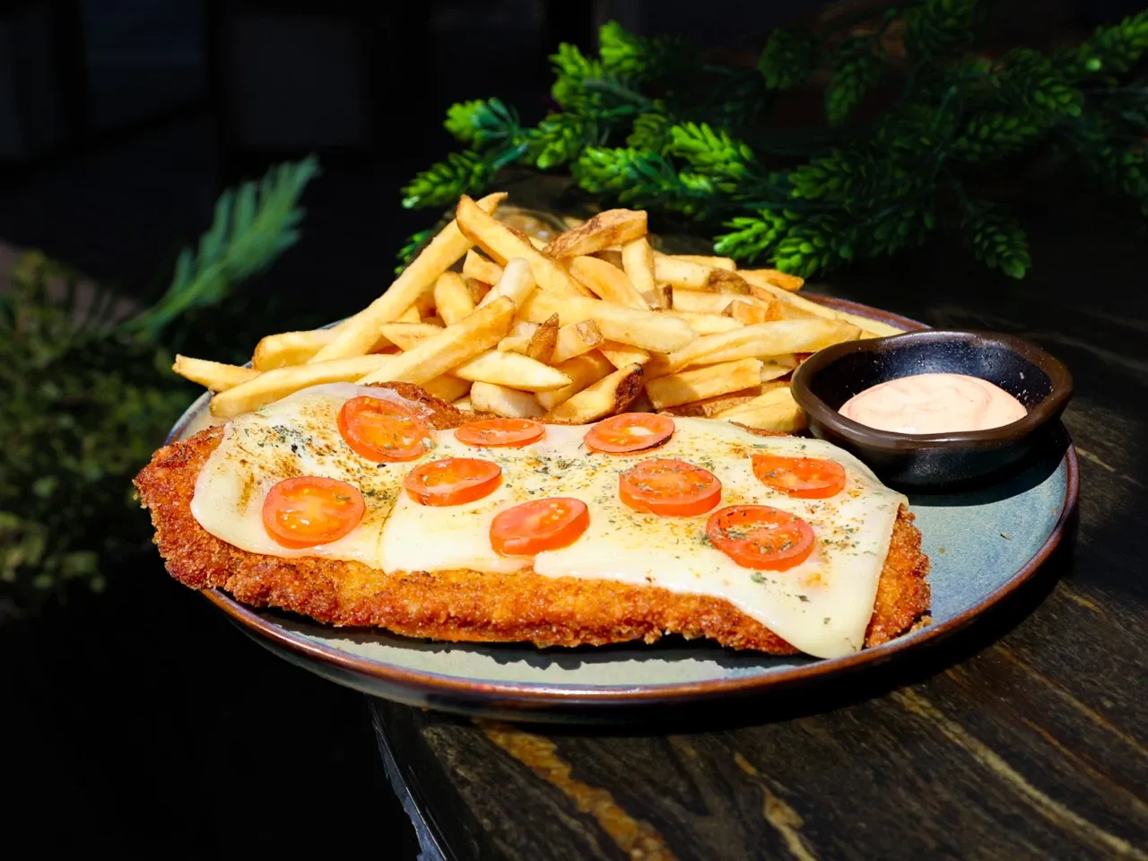 Milanesa dorada y crujiente, coronada con queso fundido, tomates cherry asados y un toque de orégano que realza su sabor casero. A un costado, papas fritas bien doradas y un potecito de salsa golf listo para untar y darle ese guiño clásico e irresistible al conjunto.