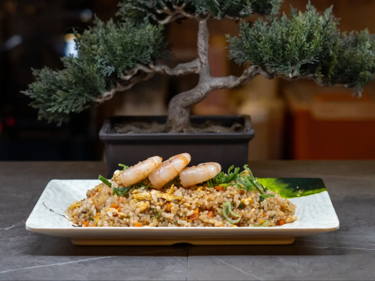 exquisito arroz japonés salteado y aromatizado con aceite de camarón, preparado con cebollín, zanahoria, huevo y camarones salteados.