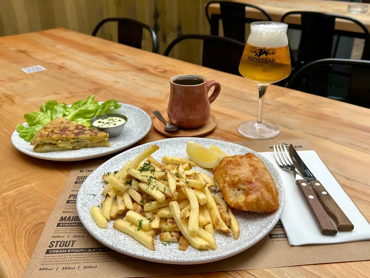 Calugas de pescado del día en batido de nuestra Kross Ipa, papas fritas, salsa tártara, y mayo merkén.