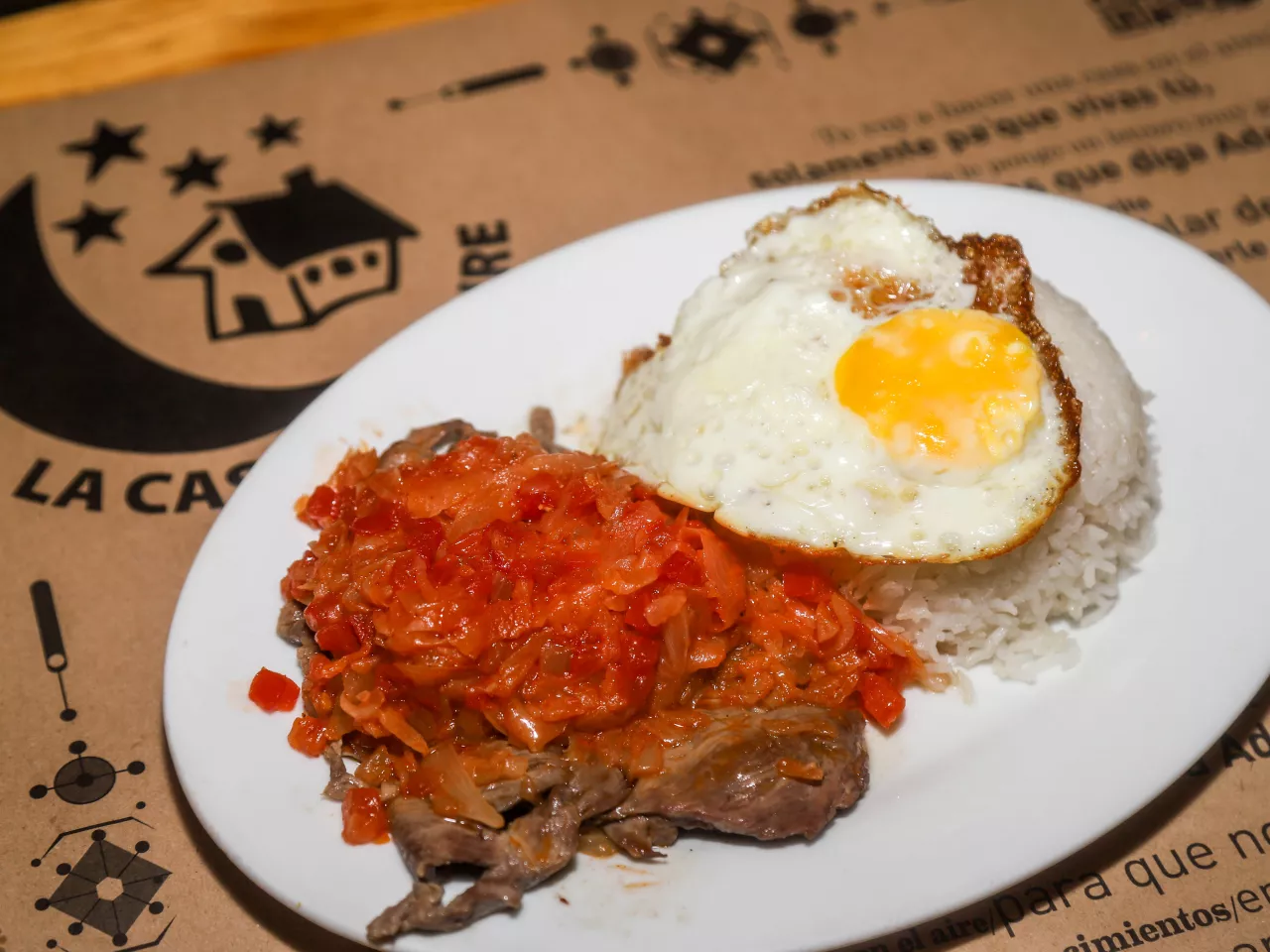 Carne de lomo, huevo frito, arroz y salsa criolla de hogao