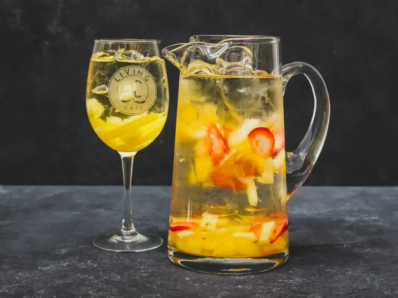 Refrescante Jarra de Vino Blanco y Licor de Sauco macerados en Piña, Durazno, Naranja y Lima