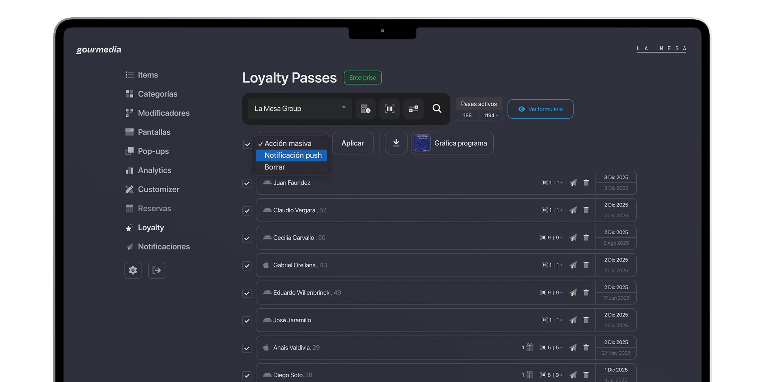 Tarjetas digitales de fidelización para Apple y Google Wallet. Personalizadas, siempre activas, con beneficios, notificaciones push y control total desde un solo dashboard.