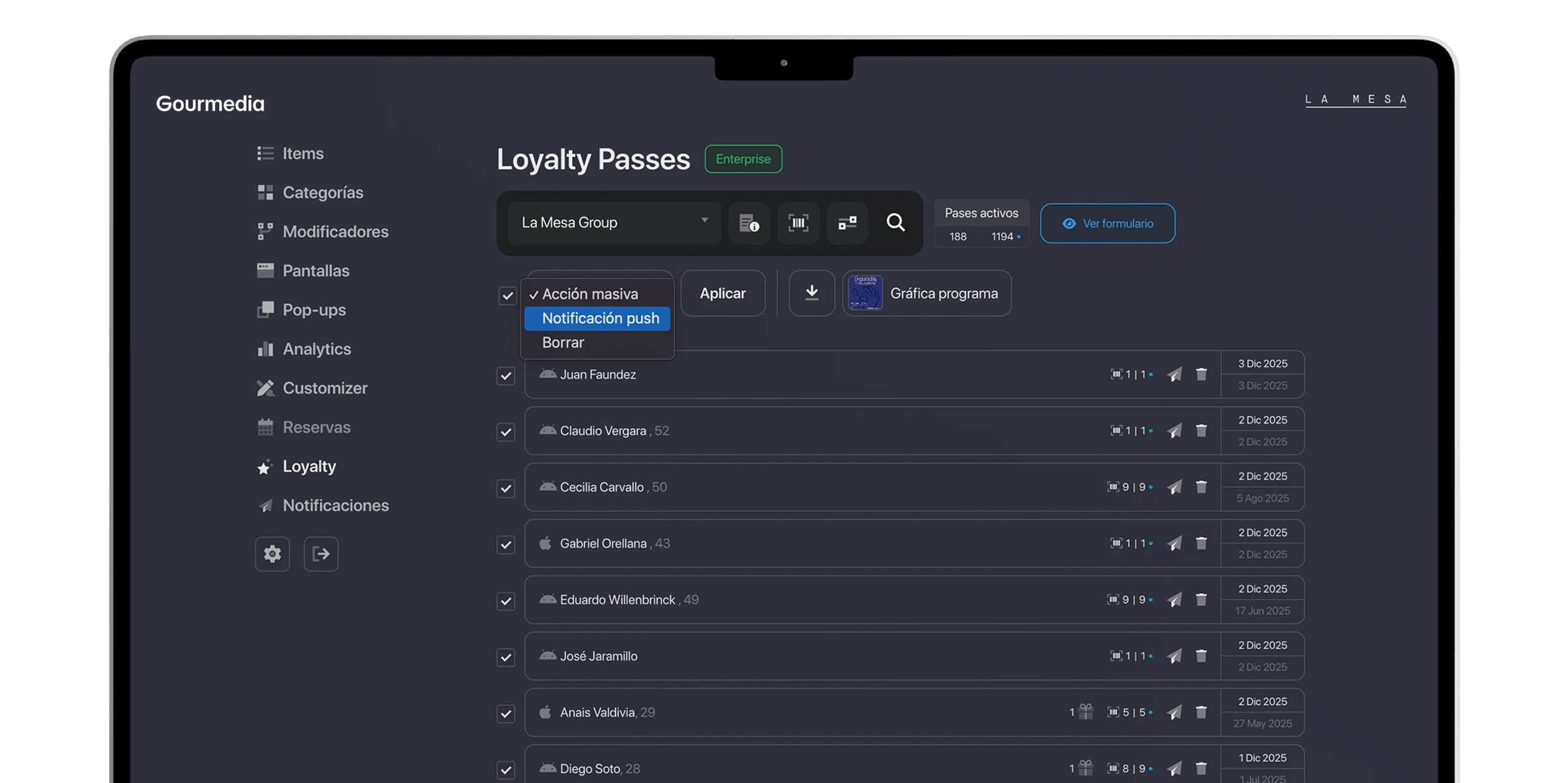 Tarjetas digitales de fidelización para Apple y Google Wallet. Personalizadas, siempre activas, con beneficios, notificaciones push y control total desde un solo dashboard.