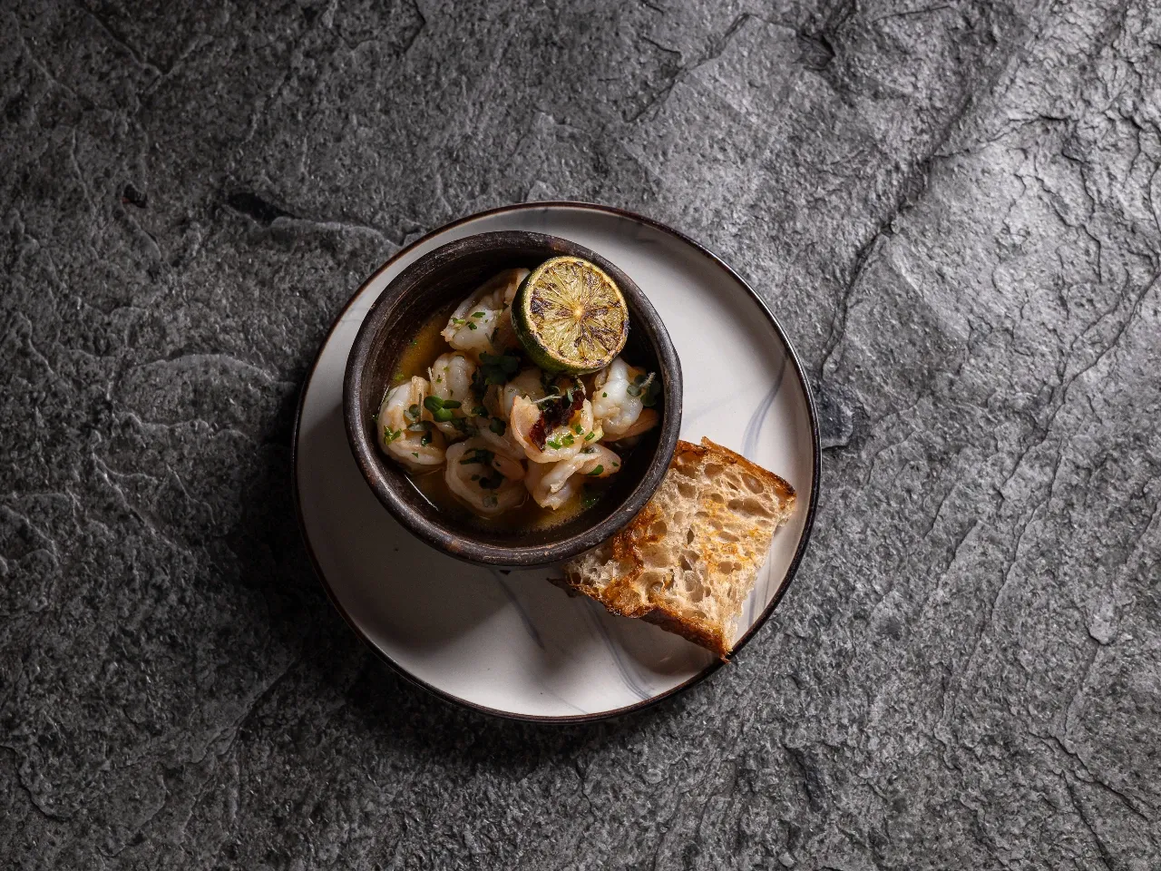 Camarones ecuatorianos cocinados en aceite de oliva, ajo, cacho de cabra y un toque de vino blanco