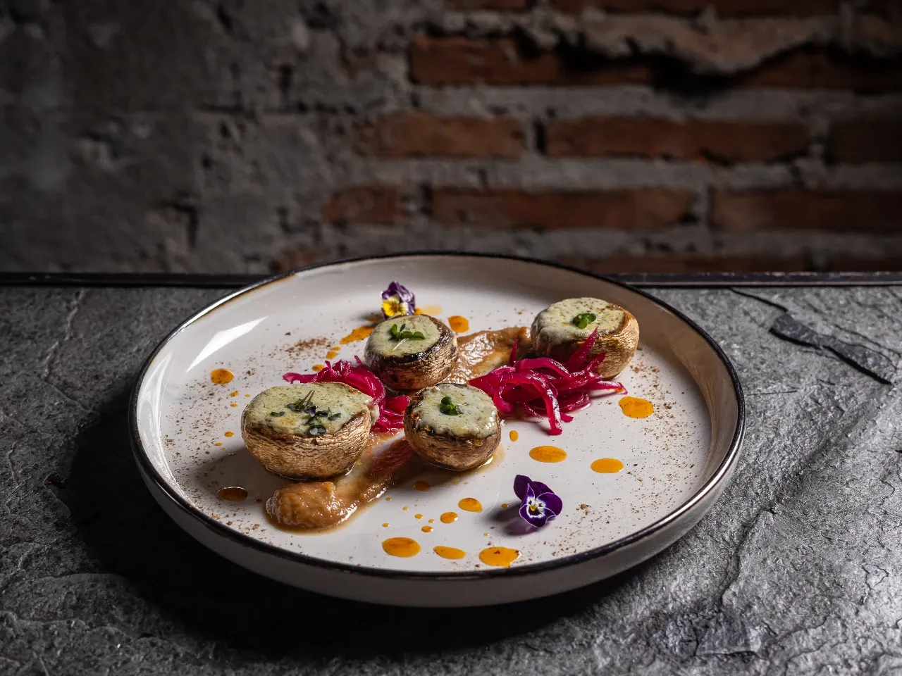 Champiñón relleno con duxelle, gratinado con queso azul y confitura de cebolla al vermut, acompañado de cebolla morada encurtida