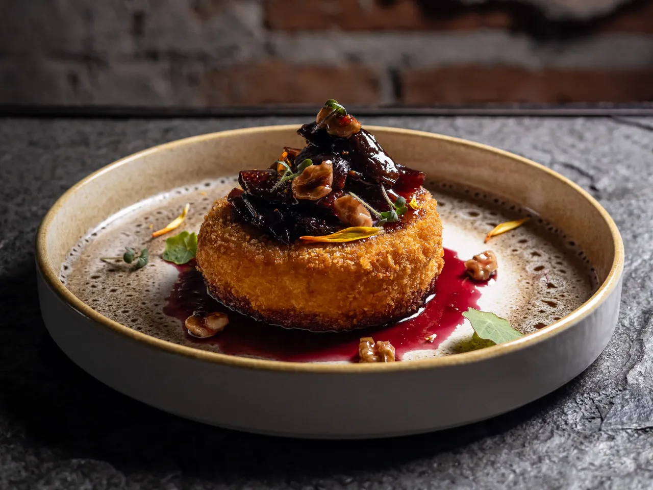 Queso camembert frito, con salsa de higo y nueces con reducción de Cabernet Sauvignon.