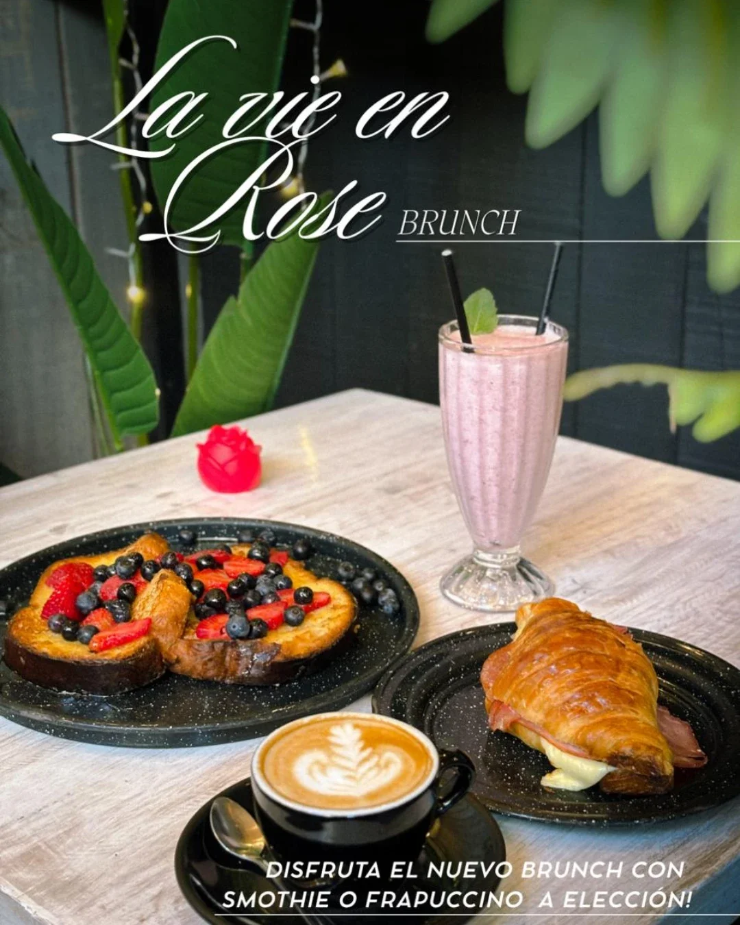 Nuestras maravillosas tostadas francesas doradas , un croissant de jamon y queso crujiente , smothie de fruta fresco y un cafe aromatico que completa la experiencia completa