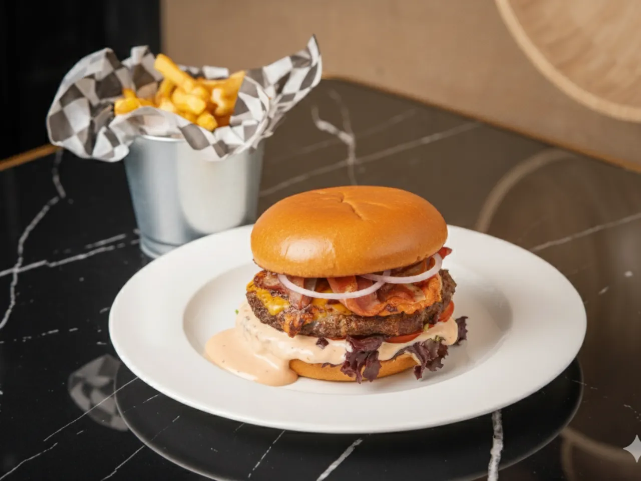 DOBLE HAMBURGUESA SMASH, QUESO CHEDDAR, BACON, AROS DE CEBOLLA, SALSA SPREAD. ACOMPAÑADO DE PAPAS FRITAS