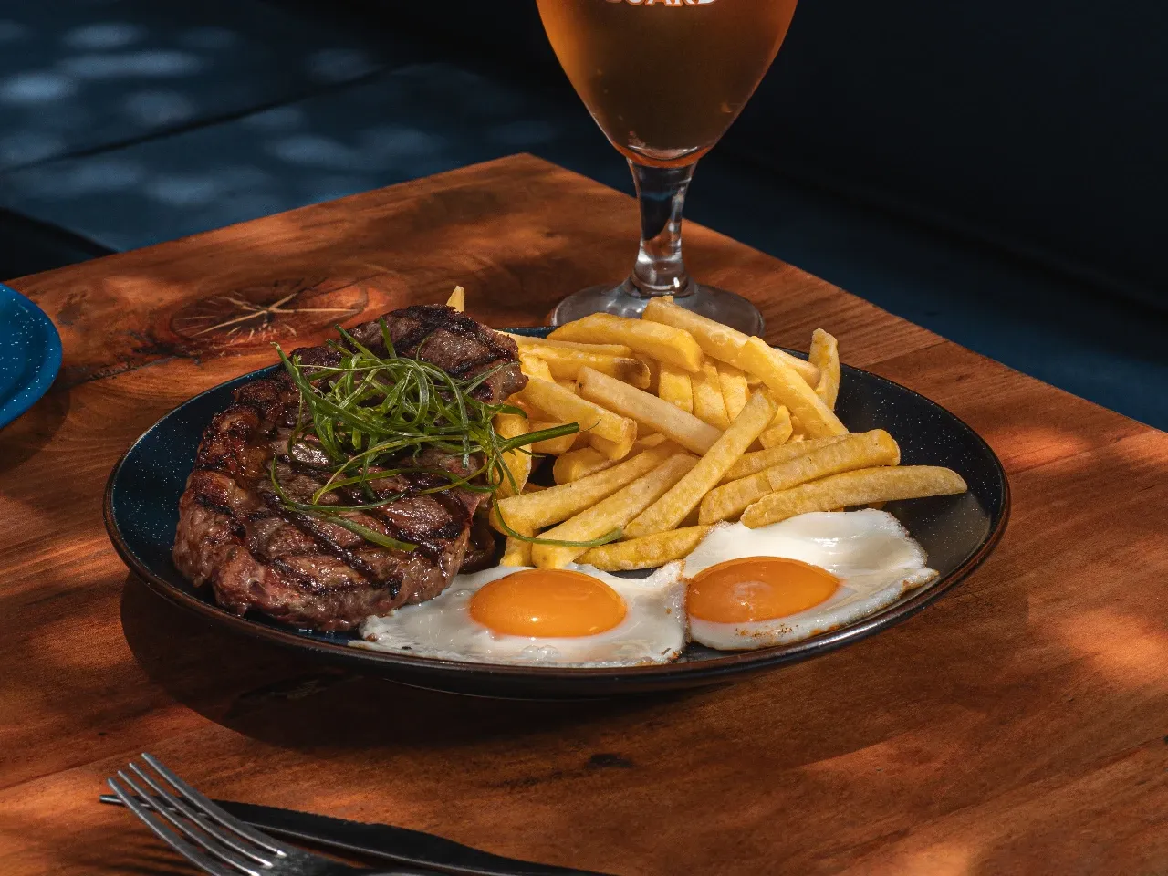 Lomo liso de vacuno acompañado con cebolla caramelizada, papas fritas y huevo frito.