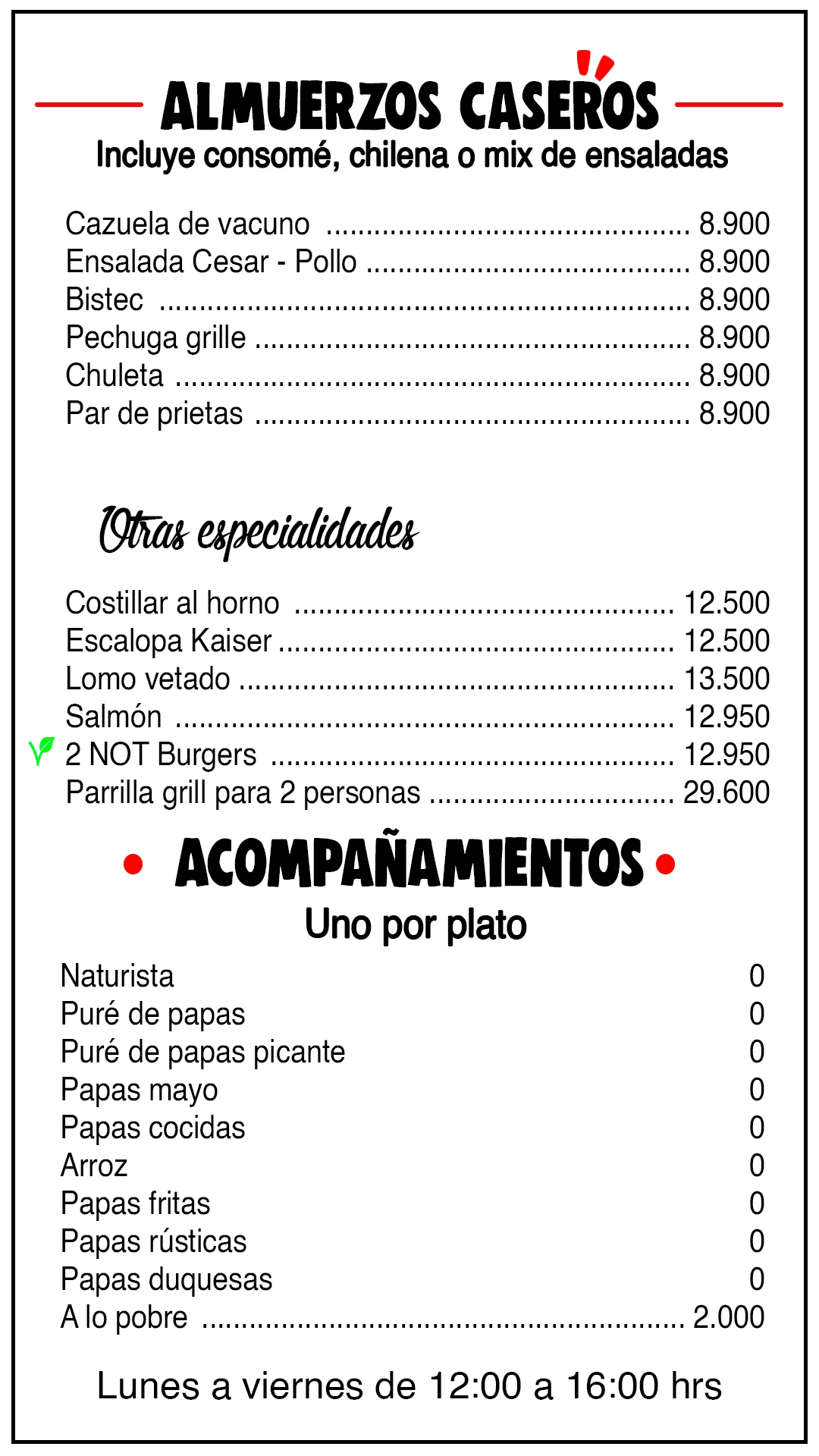2 As a elección entre italiano o Luco, incluye papas fritas y bebida. Por un adicional puedes cambiar tu bebida a schop o jugo de frutas.