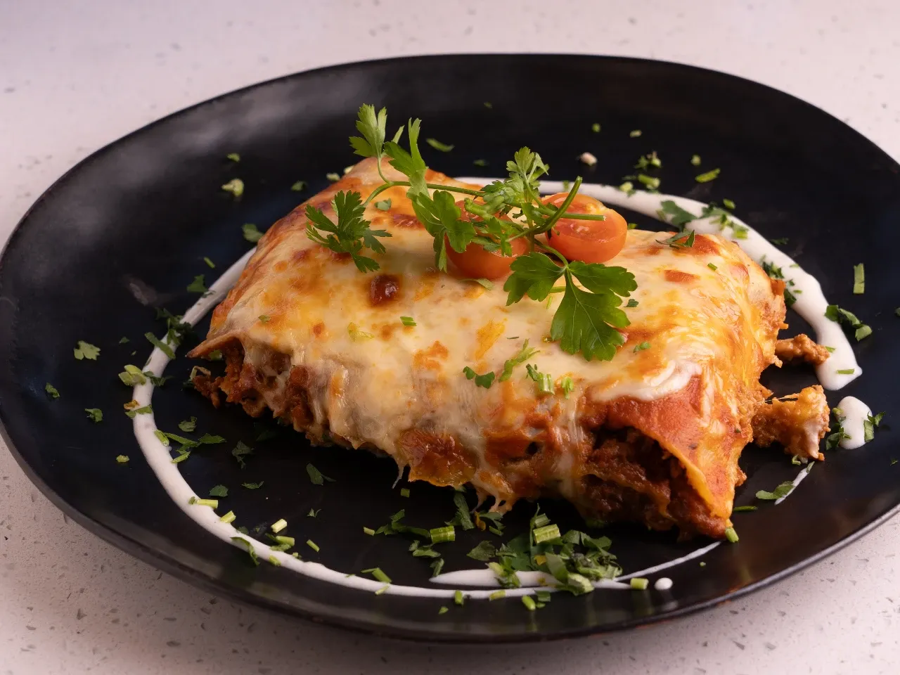 Con salsa bolognesa al malbec y salsa mornay de queso pecorino romano DOP